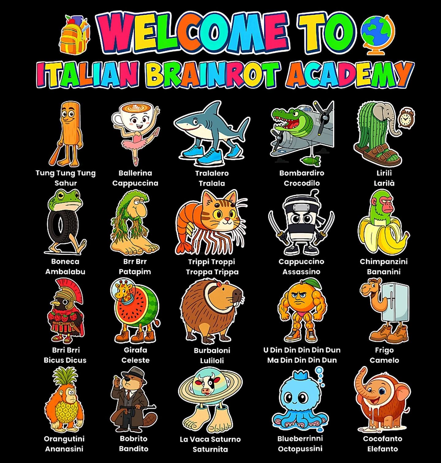Dámské tričko Italská Brainrot Akademie. Welcome to Italian Brainrot Academy česky „Vítej na Italské Brainrot Akademii“. Perfektní pro milovníky meme kultury, surrealistického humoru a fanoušky všeho nečekaně zábavného. Ukaž svůj styl, pobav okolí a vyboč z davu – italský brainrot je tu, aby ti rozbil mozek.