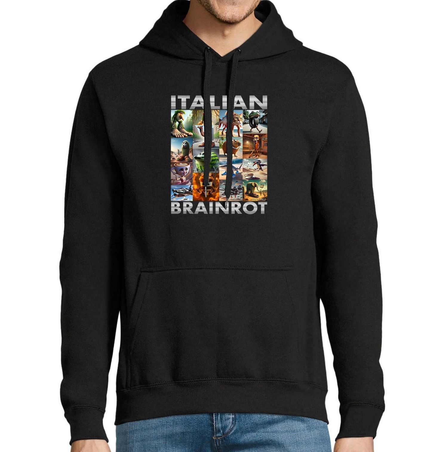 Pánská mikina Italská Brainrot Galerie. Tento design kombinuje ty nejšílenější motivy z memů a brainrot trendů – od kávových baletek, přes žáby s pneumatikou, až po kočky-ryby a létající žraloky. Ideální pro ty, kdo chtějí nosit italský brainrot na sobě a rozesmát každého, kdo se na vás podívá. Vyjádři svůj styl a lásku k meme a brainrot estetice tímhle jedinečným kouskem.