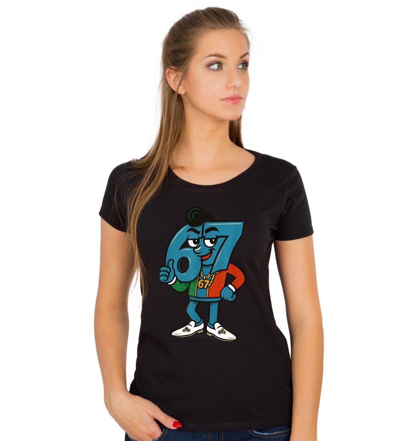 Dámské tričko Italská Legenda 67 Six Seven. Motiv 67 ve stylu six seven meme dostává tentokrát pořádný „italský vibe“. Samotné číslo 67 je tu zobrazené jako stylový frajer s klidným úsměvem, zlatým řetězem a bundou v barvách italské vlajky. Celý design působí jako vtipná parodie na „mafiánsky-cool italského frajera“, ale v roztomilém a odlehčeném meme stylu - ideální pro všechny, kdo milují číslo 67, humor a originální motivy.