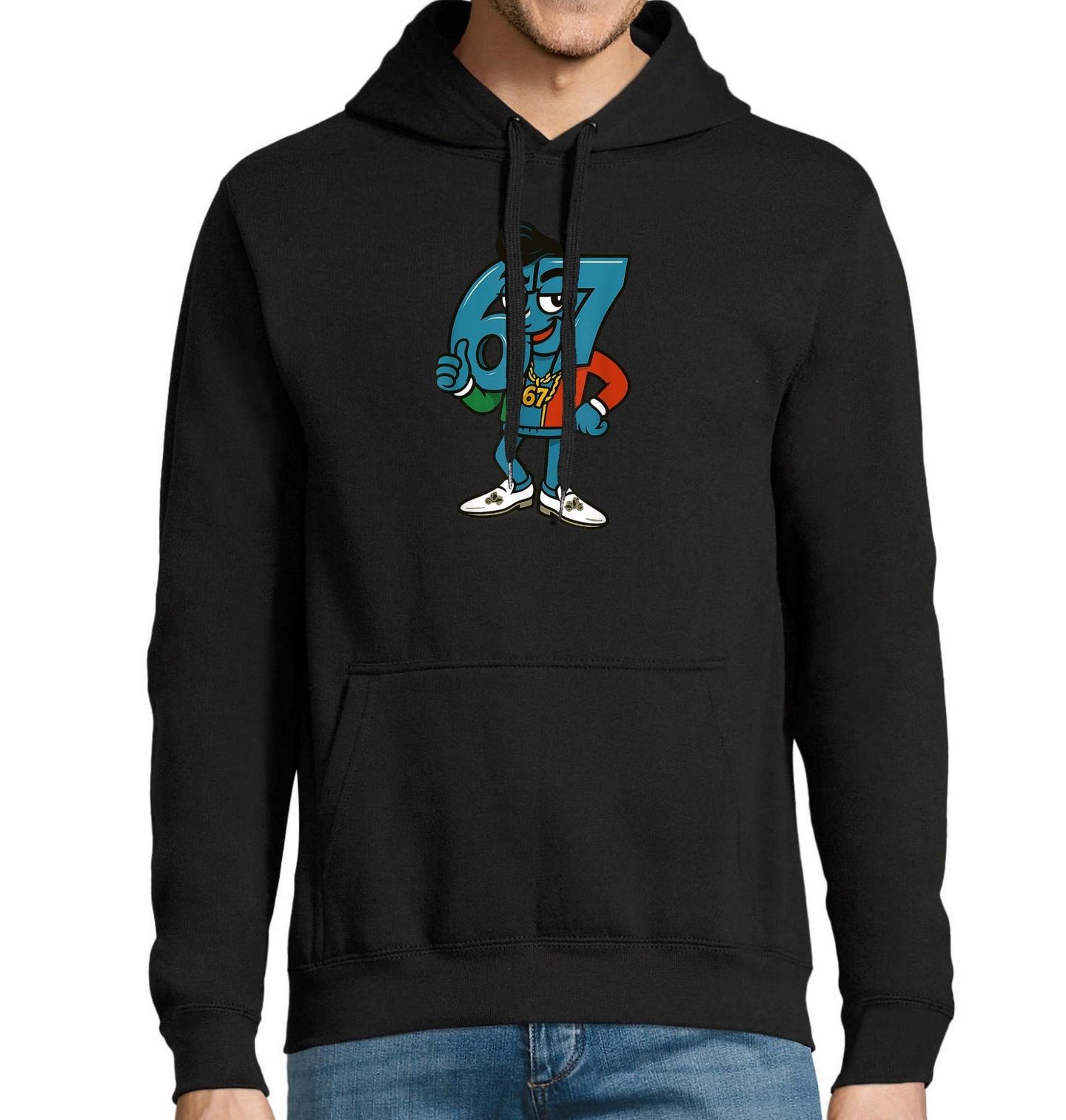 Pánská mikina Italská Legenda 67 Six Seven. Motiv 67 ve stylu six seven meme dostává tentokrát pořádný „italský vibe“. Samotné číslo 67 je tu zobrazené jako stylový frajer s klidným úsměvem, zlatým řetězem a bundou v barvách italské vlajky. Celý design působí jako vtipná parodie na „mafiánsky-cool italského frajera“, ale v roztomilém a odlehčeném meme stylu - ideální pro všechny, kdo milují číslo 67, humor a originální motivy.