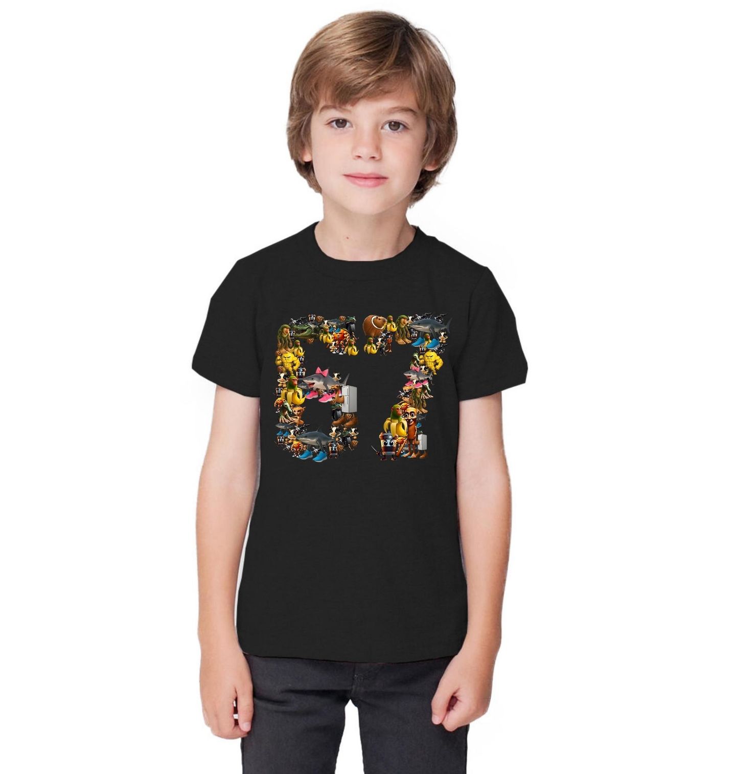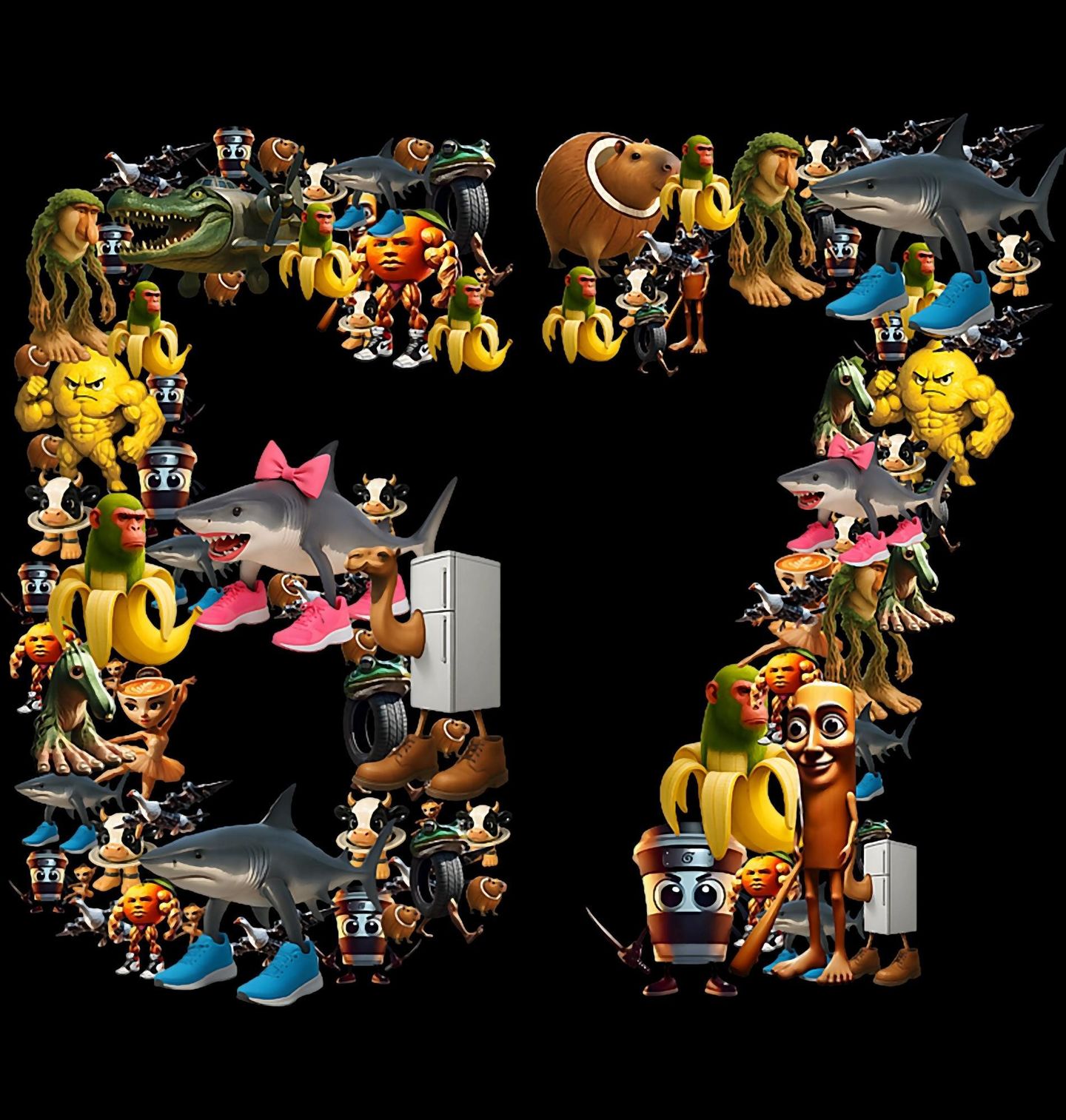 Dětské tričko Italský Brainrot 67 Six Seven. Tenhle motiv 67 je čistý italský brainrot v té nejšílenější podobě! Čísla six seven jsou složená z ikonických postaviček a bizarních objektů ve stylu meme – uvidíš tu žraloka v teniskách, banán s výrazem zabijáka, lednici, podivné figurky, opice, zvířata i totálně ujeté tvory, kteří dohromady skládají tvar čísla 67.