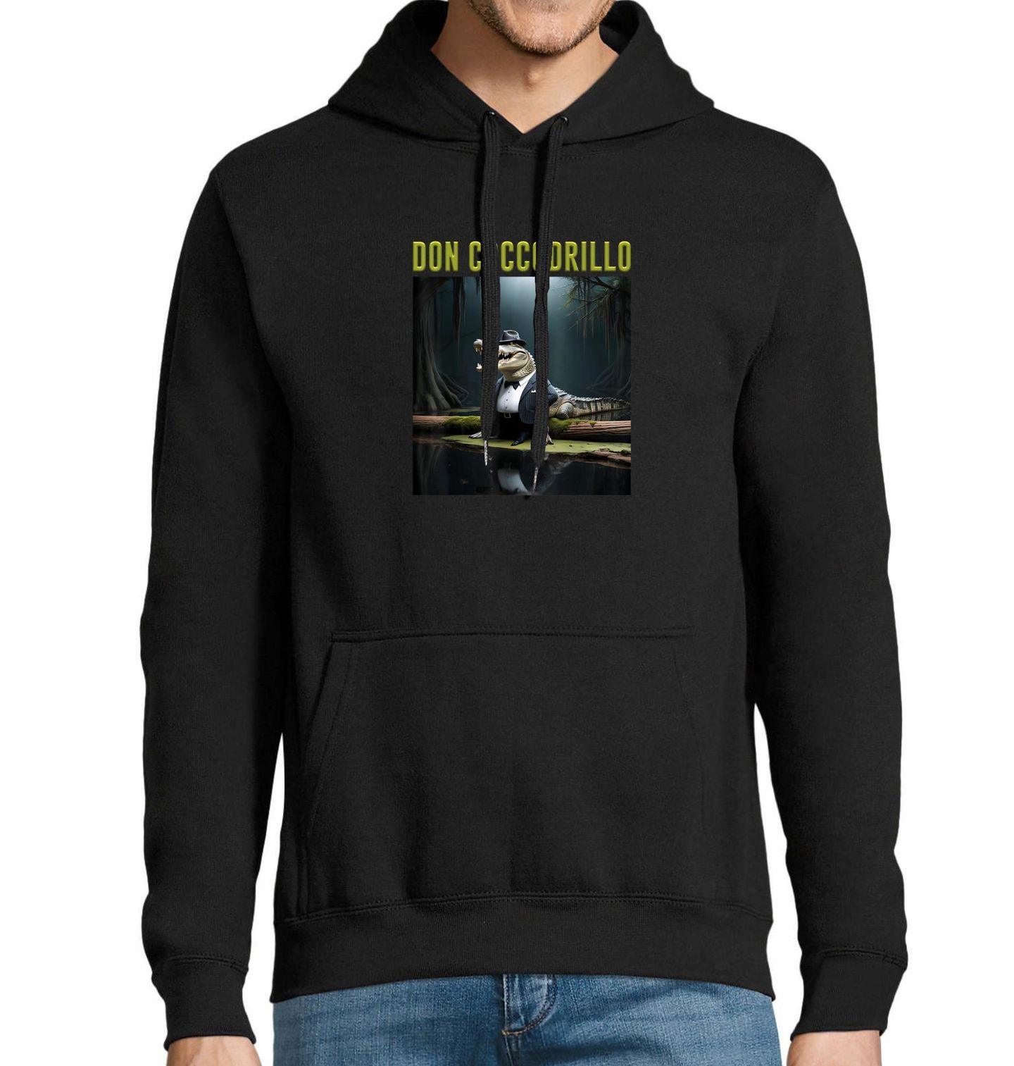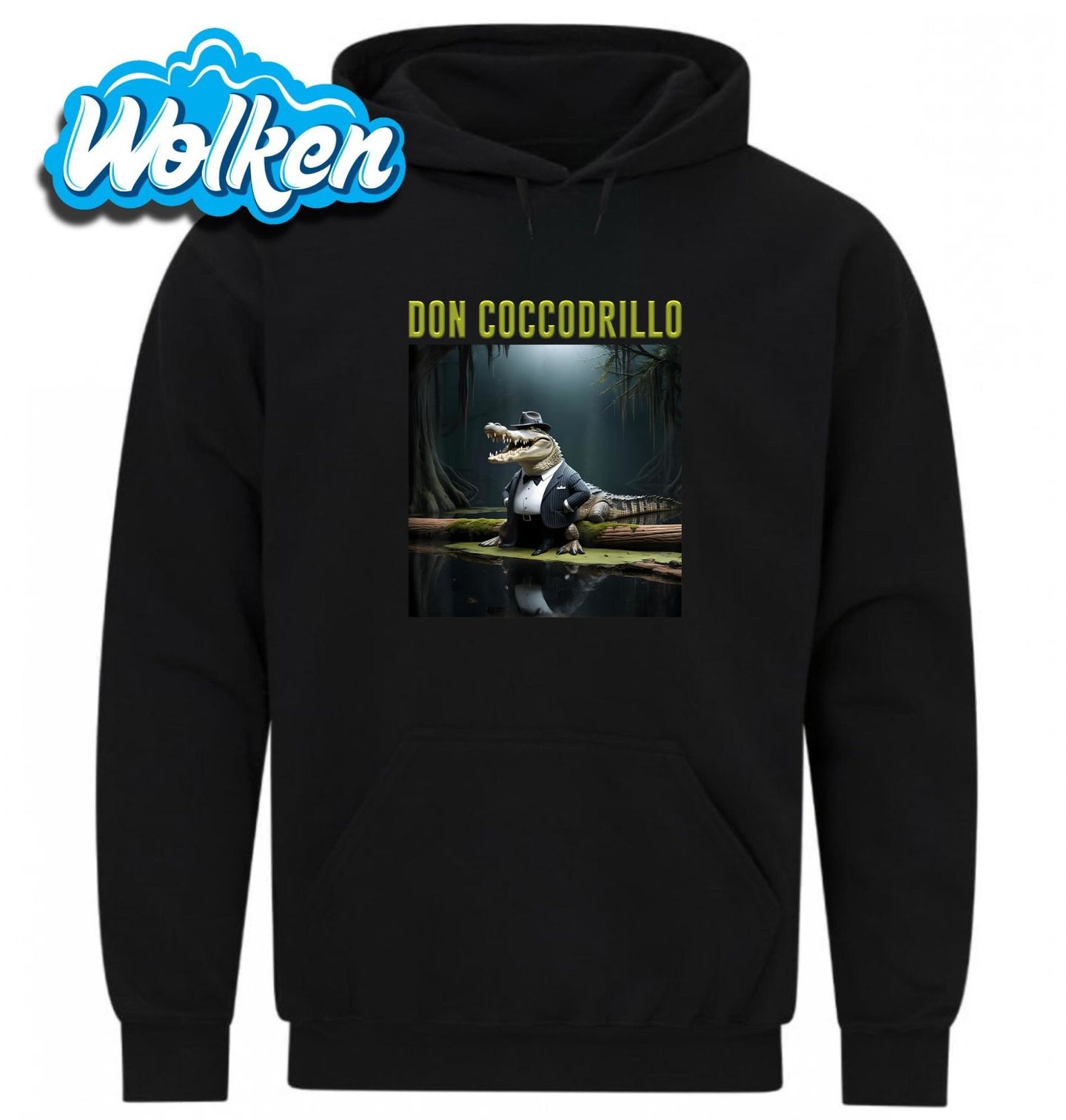 Pánská mikina Italský Brainrot Don Coccodrillo. Majestátný krokodýl v luxusním obleku, klobouk nakřivo, stojí na pařezu v bažině a vypadá, jako by měl na starost celý podvodní podsvětí. Kombinace gangsterského šarmu a absurdního meme kouzla dělá z tohoto motivu naprostý vizuální klenot.