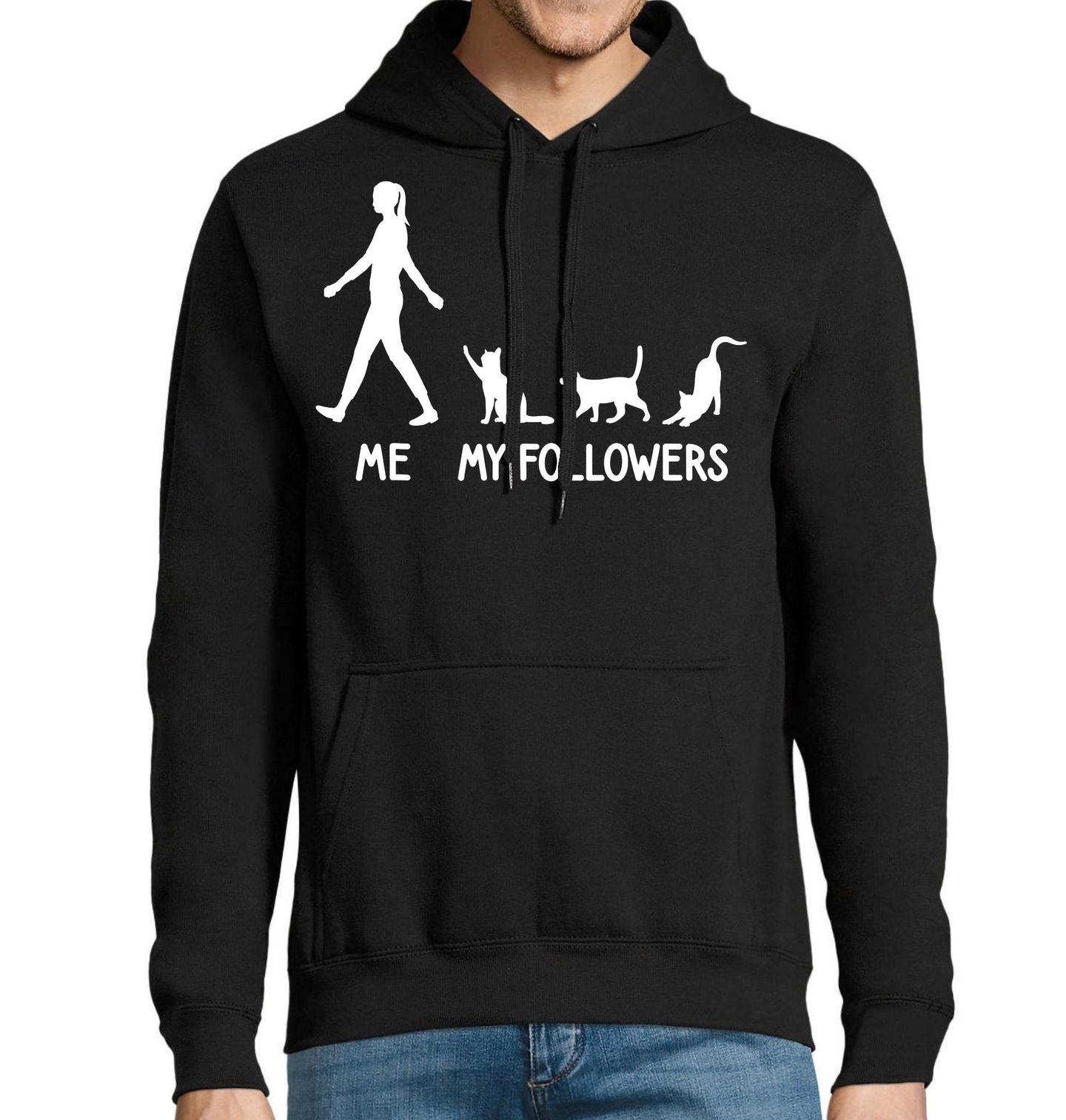 Pánská mikina Já a Moji Kočičí Sledující. Originální ilustrace s motivem koček znázorňuje kontrast „me“ a „my followers“, kteří jsou vtipně nahrazeni kočkami. Tento motiv pobaví každého, kdo miluje kočky a bere sociální sítě s nadhledem.