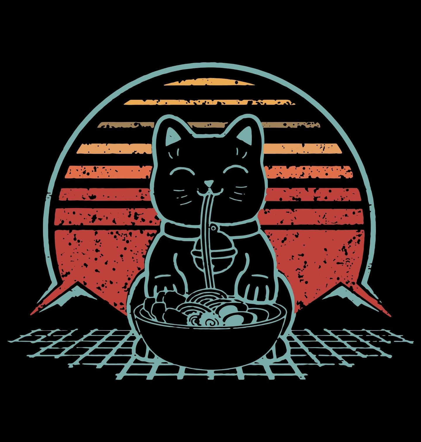 Pánské tričko Japonská Kočka pro Štěstí s Ramenem. Japonská kočka pro štěstí se nazývá Maneki Neko (招き猫) a je to tradiční japonský talisman ve tvaru sedící kočky, která má přinášet štěstí a bohatství. Stylová ilustrace, kde tato kočka s radostí slurpuje misku ramenu, zasazená do retro kruhového pozadí evokujícího západ slunce nad horami. Skvělé pro každého, kdo miluje Japonsko, retro styl a kočky.