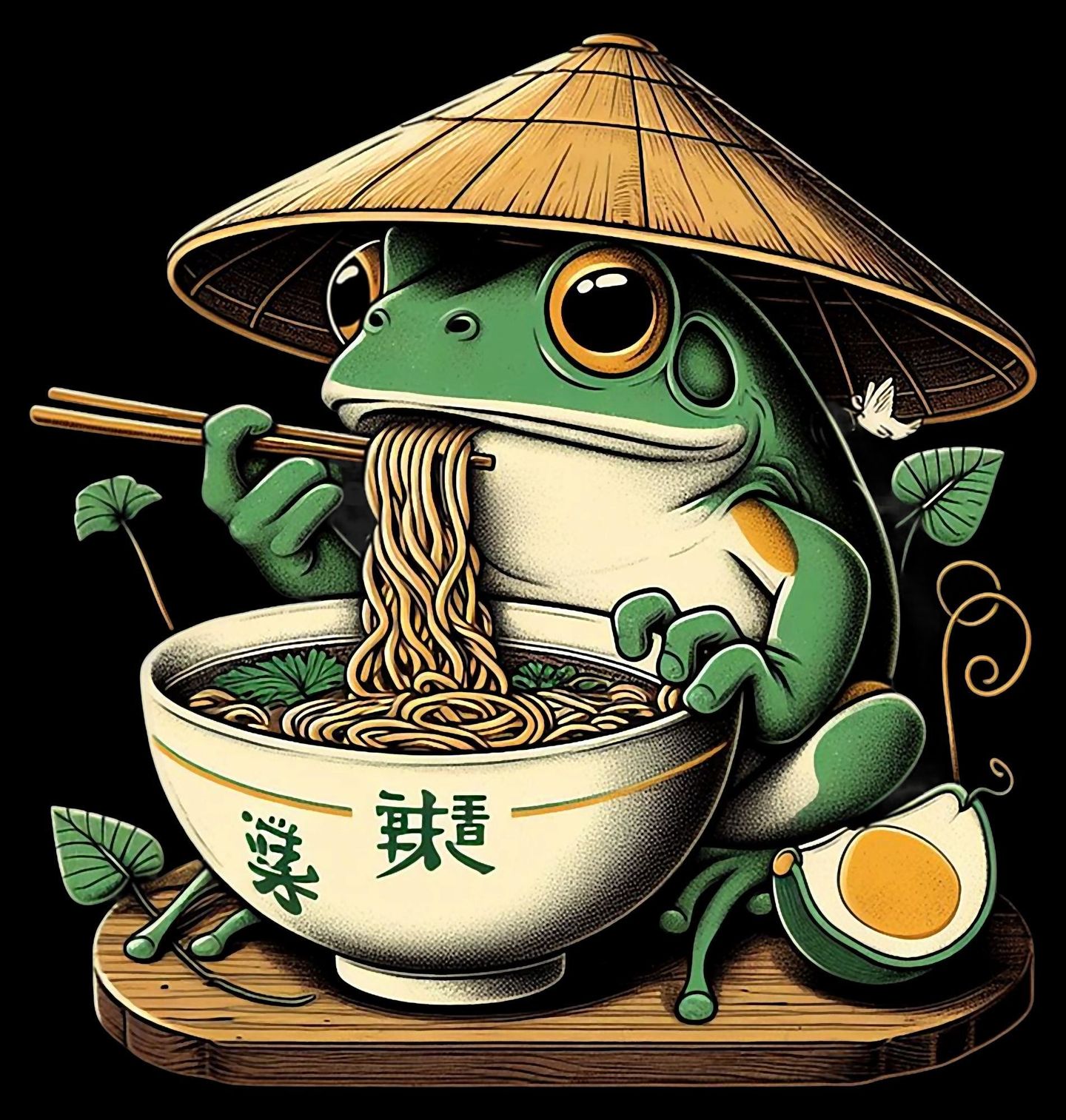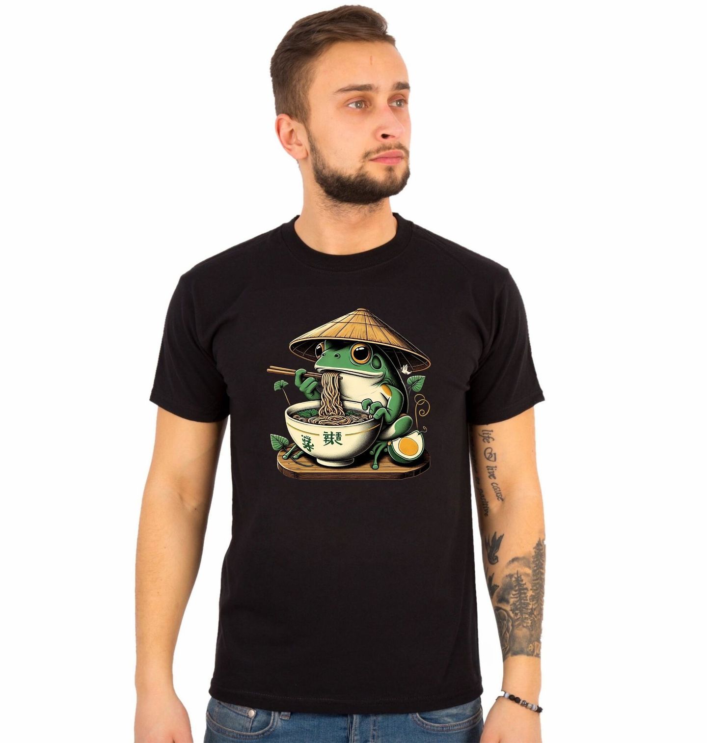 Pánské tričko Japonská Žába a Ramen. Objev kouzlo dalekého východu s tímto hravým motivem – žába si vychutnává tradiční japonský ramen v klobouku jako pravý gurmán. Ideální dárek pro každého, kdo miluje anime a Japonsko a ramen.