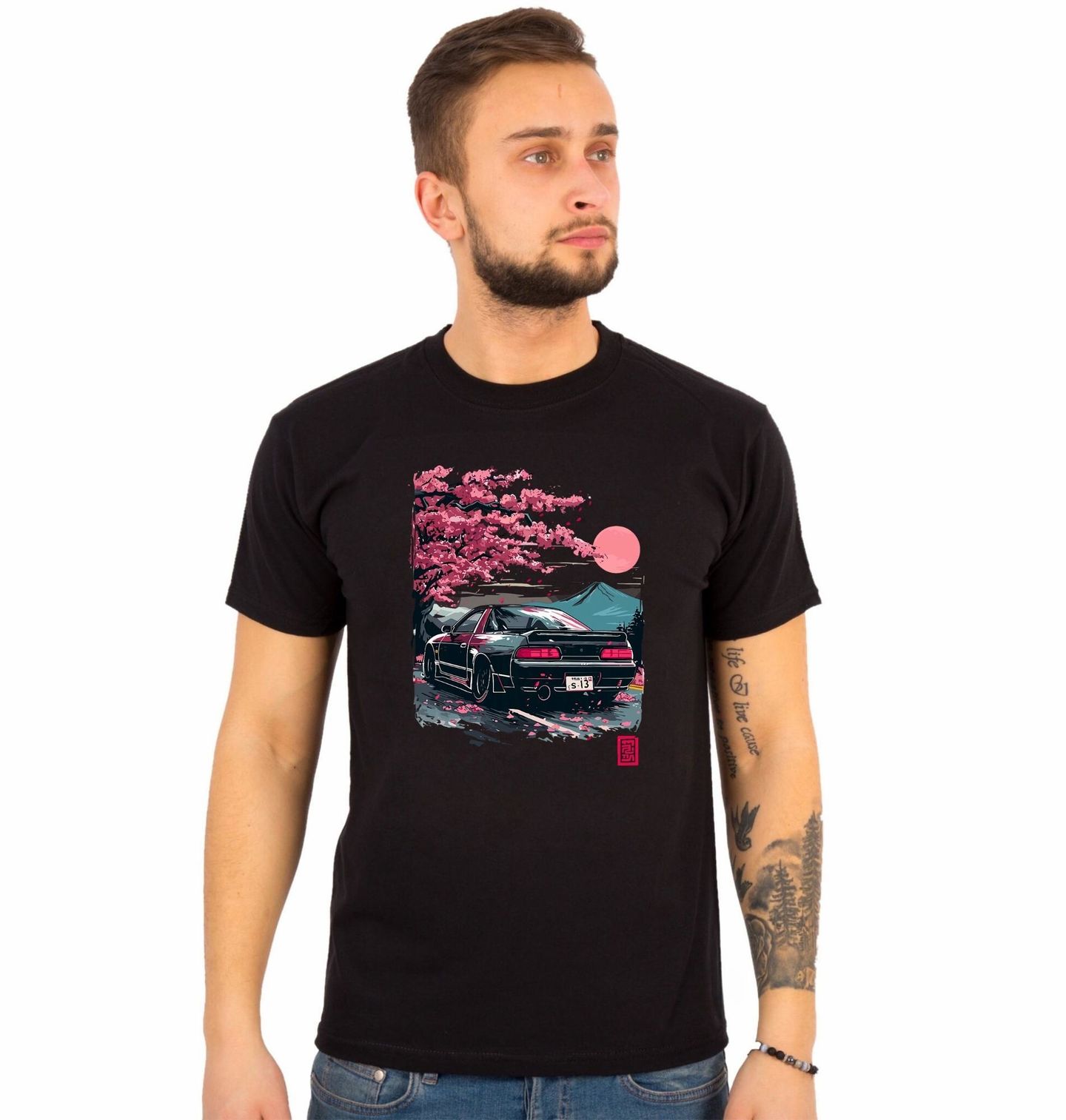Pánské tričko Japonské Auto pod Horou Fuji. Sakura Drift - vášeň pro auto a Japonsko v jednom motivu. Motiv spojuje klid japonské přírody s adrenalinem městských driftů – ideální pro každého milovníka JDM kultury, který cítí sílu auta i duši silnice.
