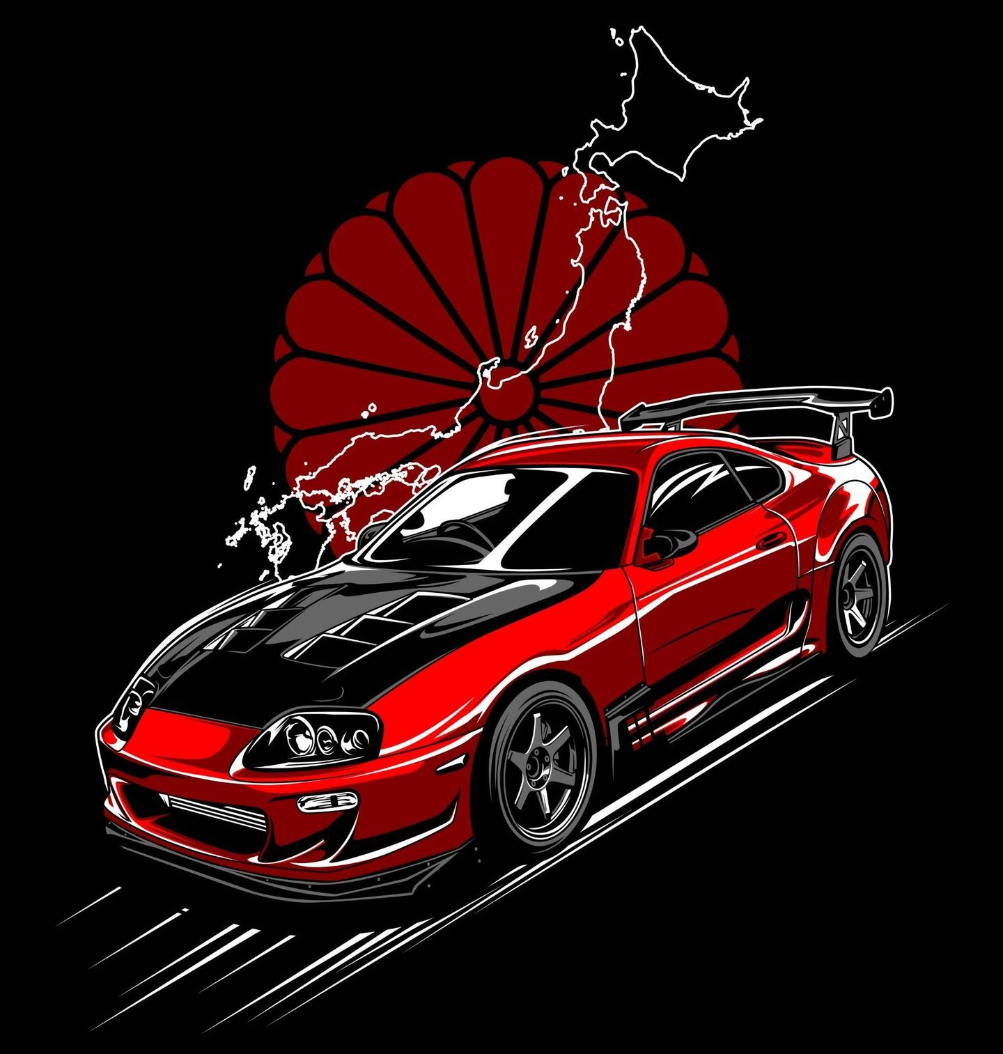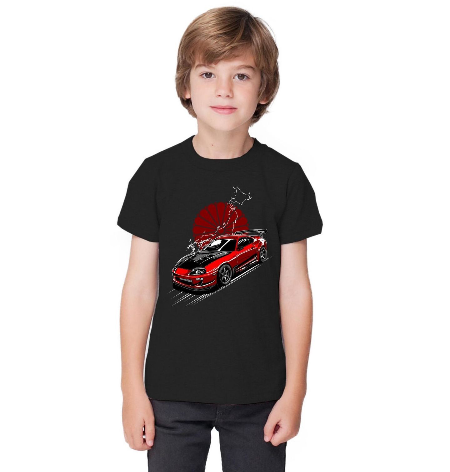 Dětské tričko Japonské Sportovní Auto. Ta mapa za autem je obrys Japonska. Je tam stylizovaná silueta japonských ostrovů – nahoře je vidět Hokkaidó, uprostřed hlavní ostrov Honšú a dole menší ostrovy jako Šikoku a Kjúšú. Spolu s červeným symbolem slunce to odkazuje na japonskou vlajku a celkově to má zvýraznit, že jde o JDM styl a japonské auto.