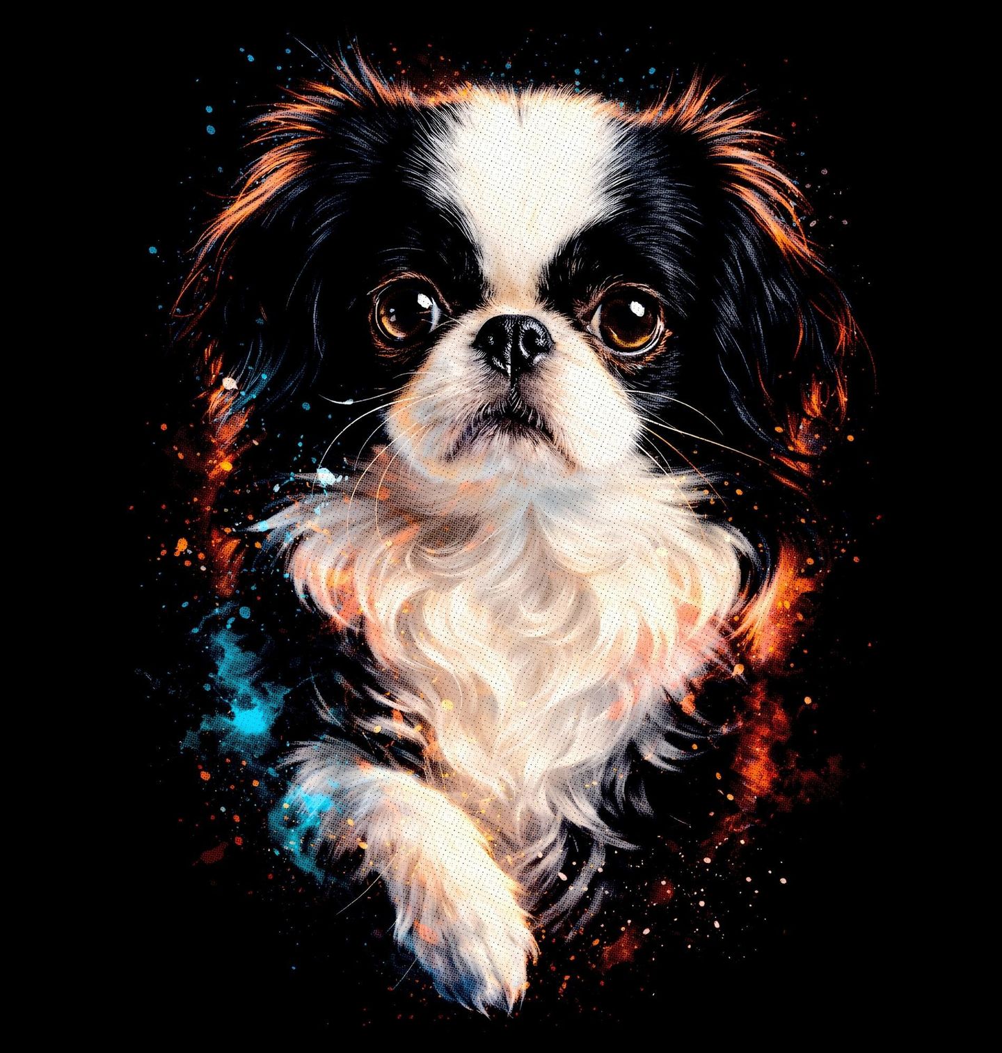 Dětské tričko Japonský chin Japan-chin. Tento malý pes si okamžitě získá srdce každého díky svým velkým očím a něžnému, téměř aristokratickému pohledu. Každý pejskař ocení jeho přátelskou a klidnou povahu. Japonský chin je pes, který miluje společnost svého majitele, rád odpočívá, ale zároveň dokáže být hravý a veselý. Je ideálním společníkem do bytu i pro všechny, kdo hledají oddaného a něžného psa.