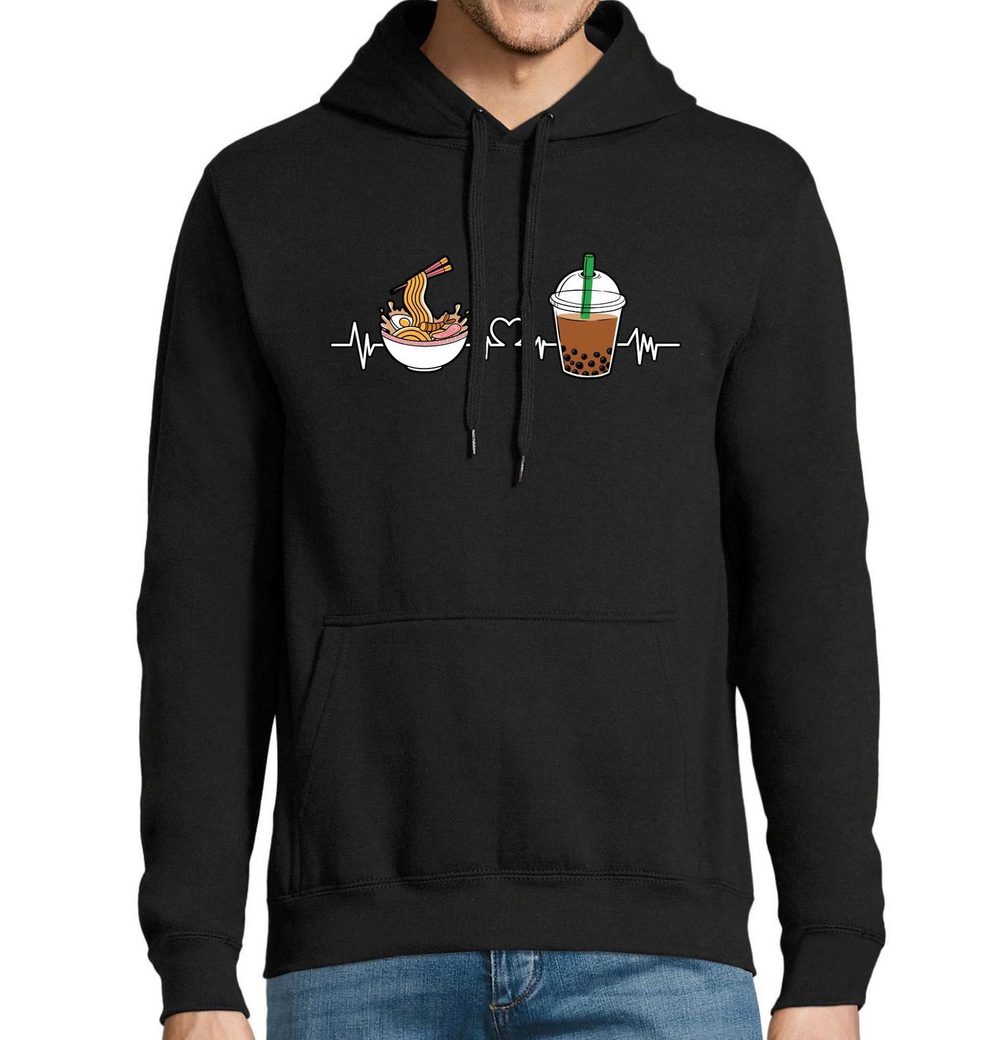 Pánská mikina Japonský Kardiogram Ramen a Bubble Tea. Životní rytmus milovníka asijské kuchyně? Jednoznačně ramen, bubble tea a pořádná dávka stylu! To vše spojuje originální motiv na tomto tričku, kde kardiogram symbolizuje vášeň pro chutě Dálného východu. Ideální pro fanoušky street foodu.