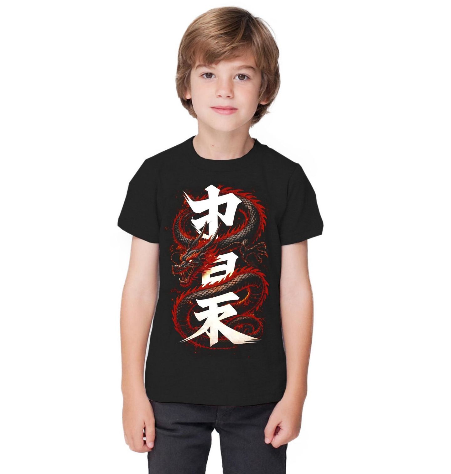 Dětské tričko Japonský Ohnivý drak. Silný a dynamický motiv zobrazuje majestátní drak, který se vine kolem výrazných japonských znaků a je obklopen plameny. Tento design symbolizuje sílu, energii a nekonečnou vitalitu. Drak zde nepůsobí jen jako mytické stvoření, ale jako zosobnění moci, respektu a vnitřní síly. Detailní provedení ohně a šupin dodává motivu agresivní a zároveň elegantní vzhled.