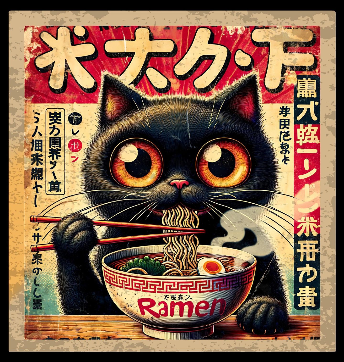 Dámské tričko Japonský Plakát Černá Kočka a Ramen. Černá kočka s obříma očima si vychutnává misku horkého ramenu, zatímco pozadí připomíná starou japonskou reklamu. Kombinace zvířecí roztomilosti a japonské estetiky dělá z tohoto motivu ideální doplněk pro každého, kdo miluje Japonsko.
