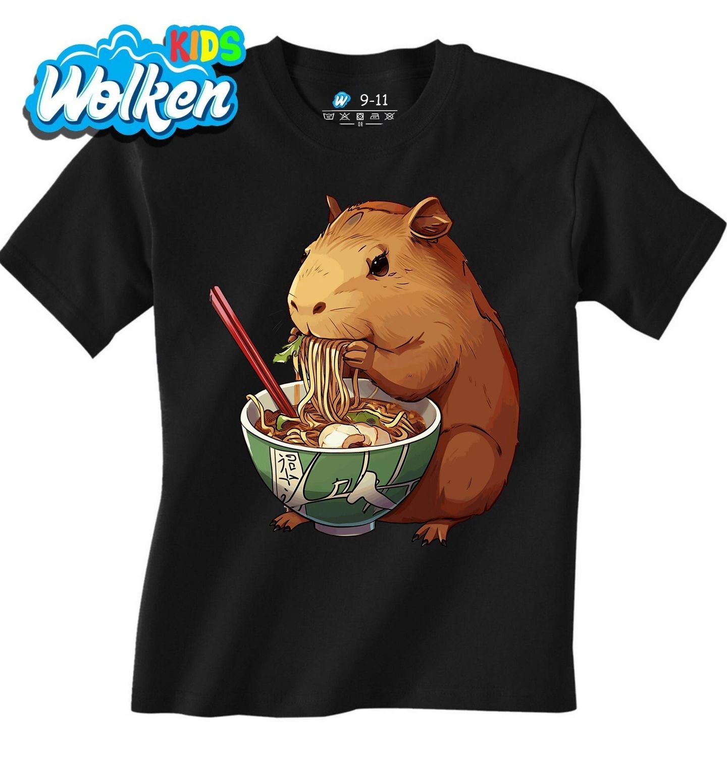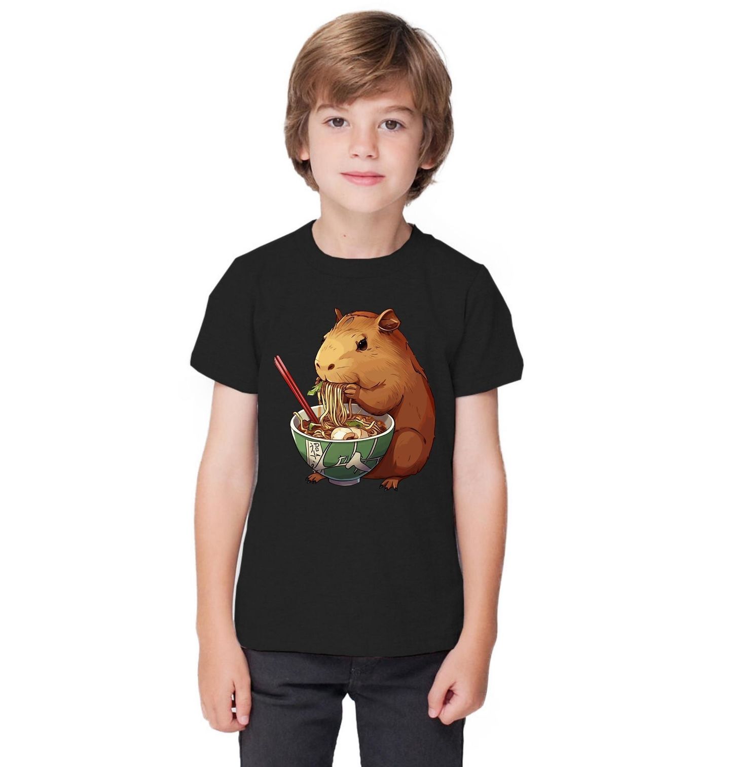 Dětské tričko Japonský Ramen s Kapybarou. Roztomilý hlodavec si pochutnává na tradiční misce ramenu – tenhle motiv přináší jedinečné spojení zvířecí pohody a chutí Japonska. Precizní ilustrace a vtipná kompozice udělají radost každému kdo miluje jídlo, Japonsko i kapybary!