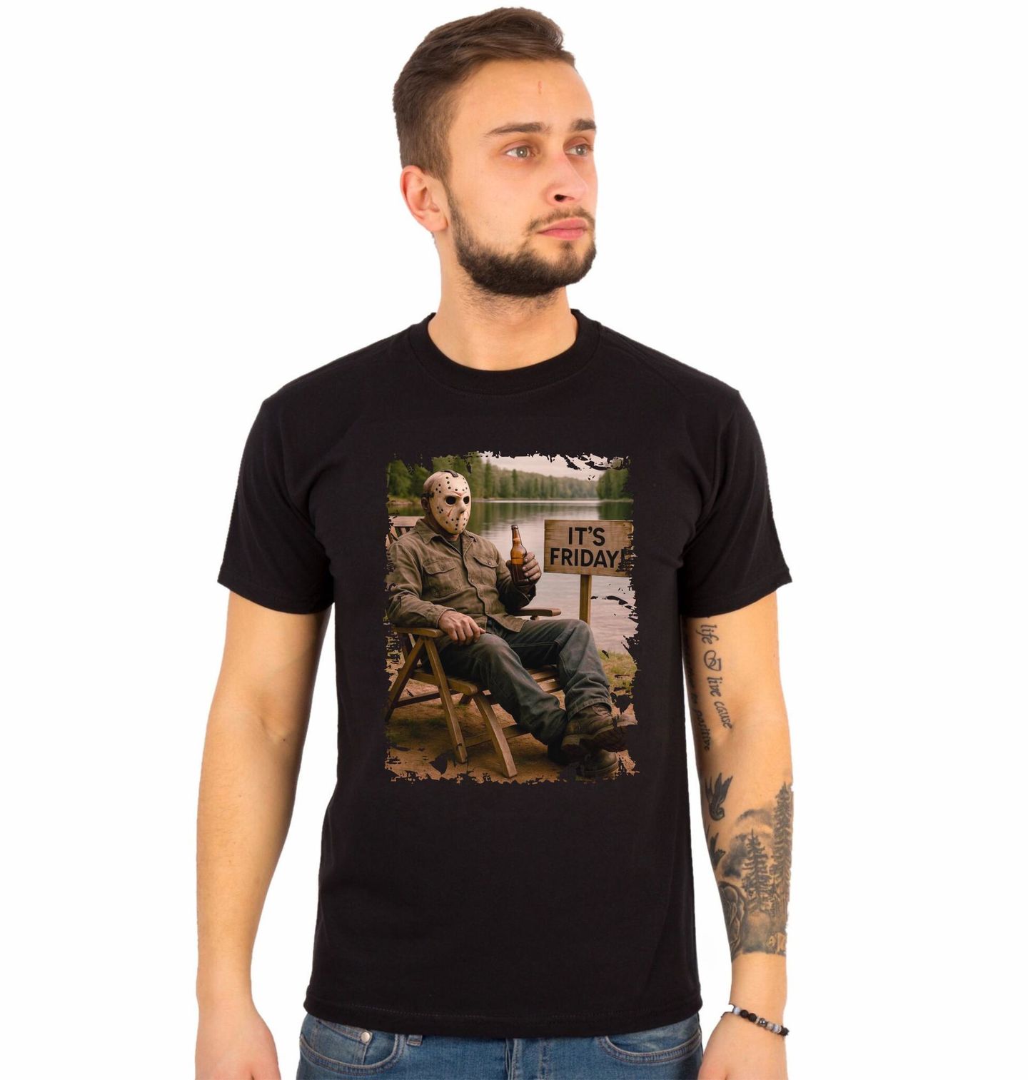 Pánské tričko Jason Voorhees s Pivem It’s Friday. Stylový a lehce ironický design inspirovaný kultovní slasher atmosférou zachycuje ikonickou postavu Jason Voorhees v klidném momentu u jezera s typickým pátečním vibe. Motiv odkazuje na legendární filmovou sérii Pátek třináctého a kombinuje temnou horor estetiku s humorem a pohodovou náladou, která zaujme každého fanouška hororů.
