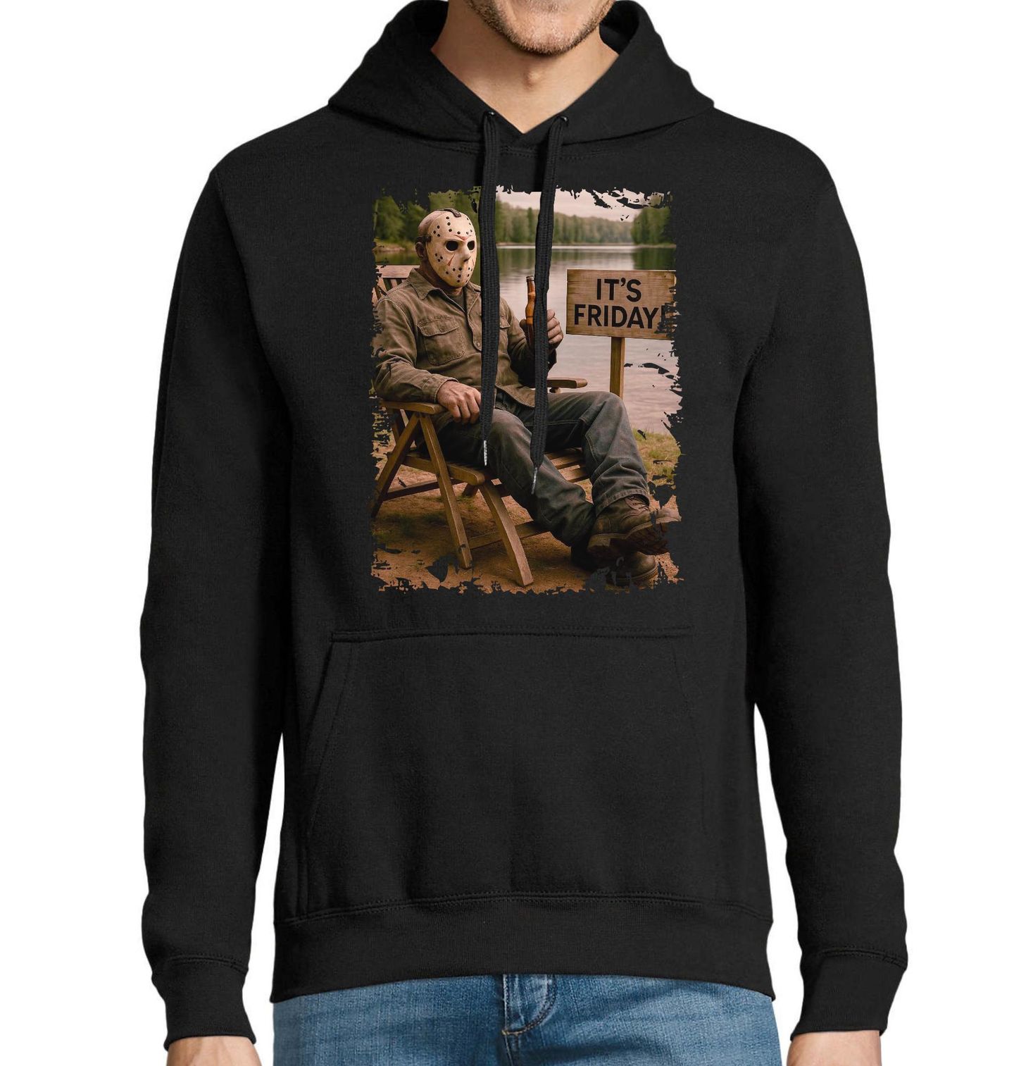 Pánská mikina Jason Voorhees s Pivem It’s Friday. Stylový a lehce ironický design inspirovaný kultovní slasher atmosférou zachycuje ikonickou postavu Jason Voorhees v klidném momentu u jezera s typickým pátečním vibe. Motiv odkazuje na legendární filmovou sérii Pátek třináctého a kombinuje temnou horor estetiku s humorem a pohodovou náladou, která zaujme každého fanouška hororů.