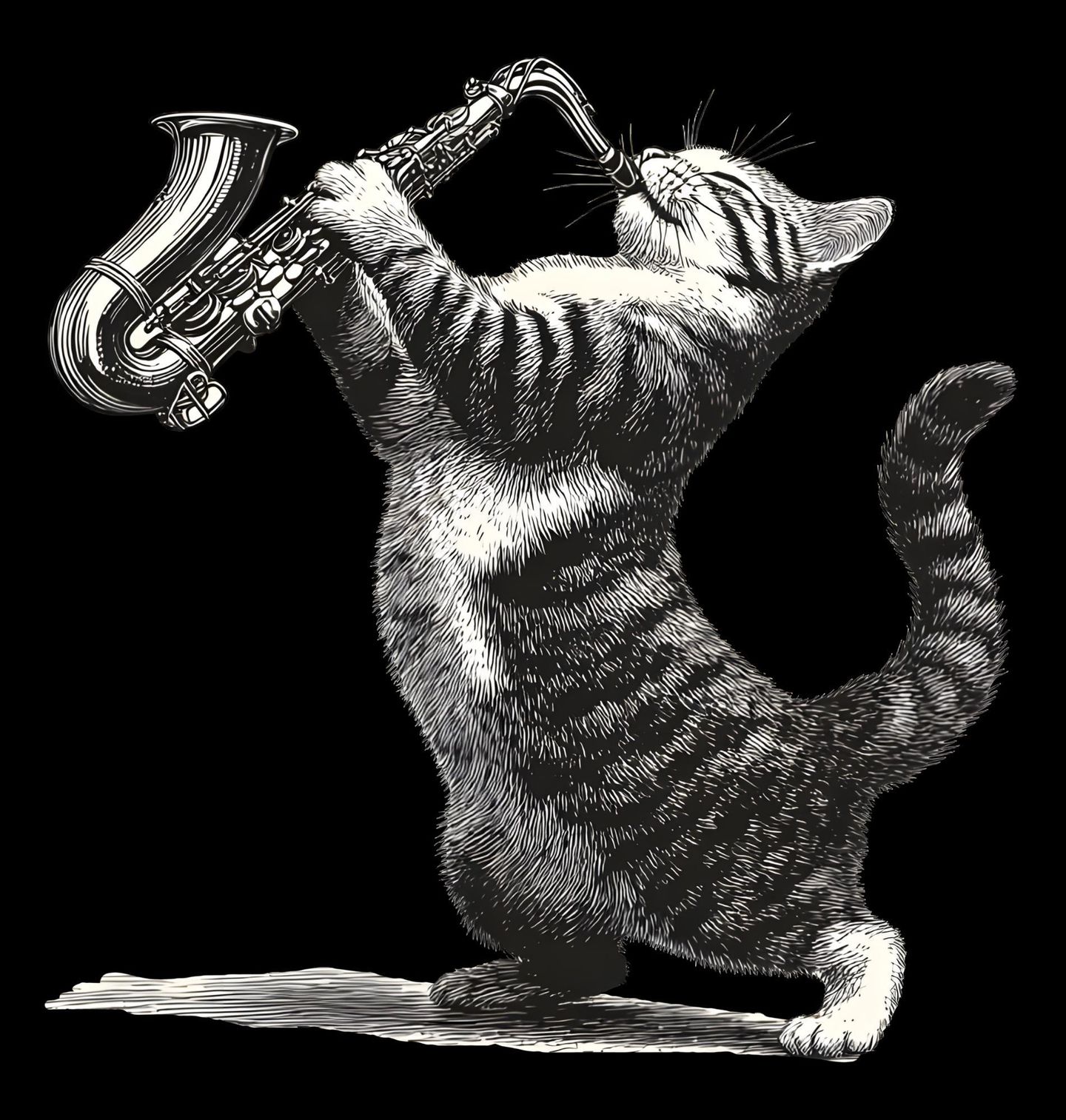 Dětské tričko Jazzová Kočka se Saxofonem. Ilustrace zachycuje postavu, kterou je kočka hrající na dechový nástroj – konkrétně saxofon, typický pro jazzovou a bluesovou hudbu. Dynamická póza a detailní kresba dodávají motivu živý a energický charakter. Černobílé provedení působí nadčasově a zvýrazňuje každý detail, díky čemuž design vynikne svou jednoduchostí i výrazem.