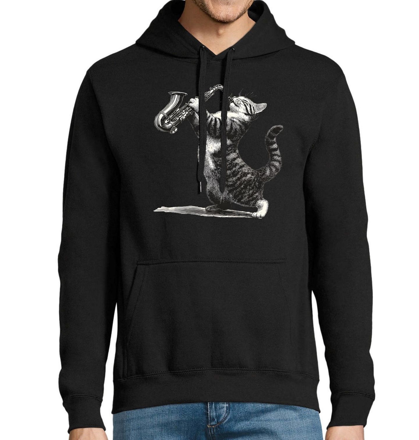 Pánská mikina Jazzová Kočka se Saxofonem. Ilustrace zachycuje postavu, kterou je kočka hrající na dechový nástroj – konkrétně saxofon, typický pro jazzovou a bluesovou hudbu. Dynamická póza a detailní kresba dodávají motivu živý a energický charakter. Černobílé provedení působí nadčasově a zvýrazňuje každý detail, díky čemuž design vynikne svou jednoduchostí i výrazem.