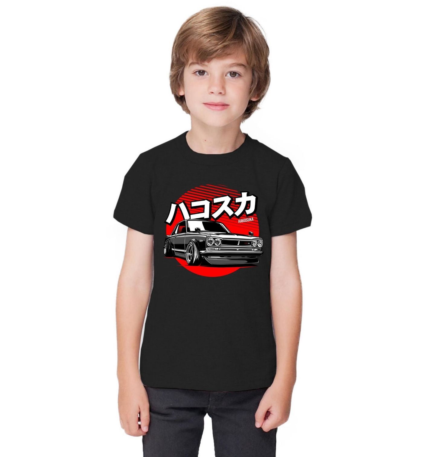 Dětské tričko JDM Auto Hakosuka Legend. Stylový motiv zachycuje ikonické klasické auto Nissan Skyline GT-R „Hakosuka“, které se stalo symbolem začátků japonské sportovní scény. Minimalistická černo-červená grafika, japonské znaky a retro silueta dávají designu autentickou atmosféru, jakou může nabídnout jen pravé Japonsko a jeho automobilová historie.