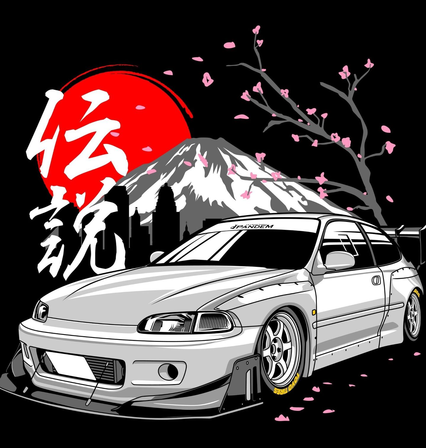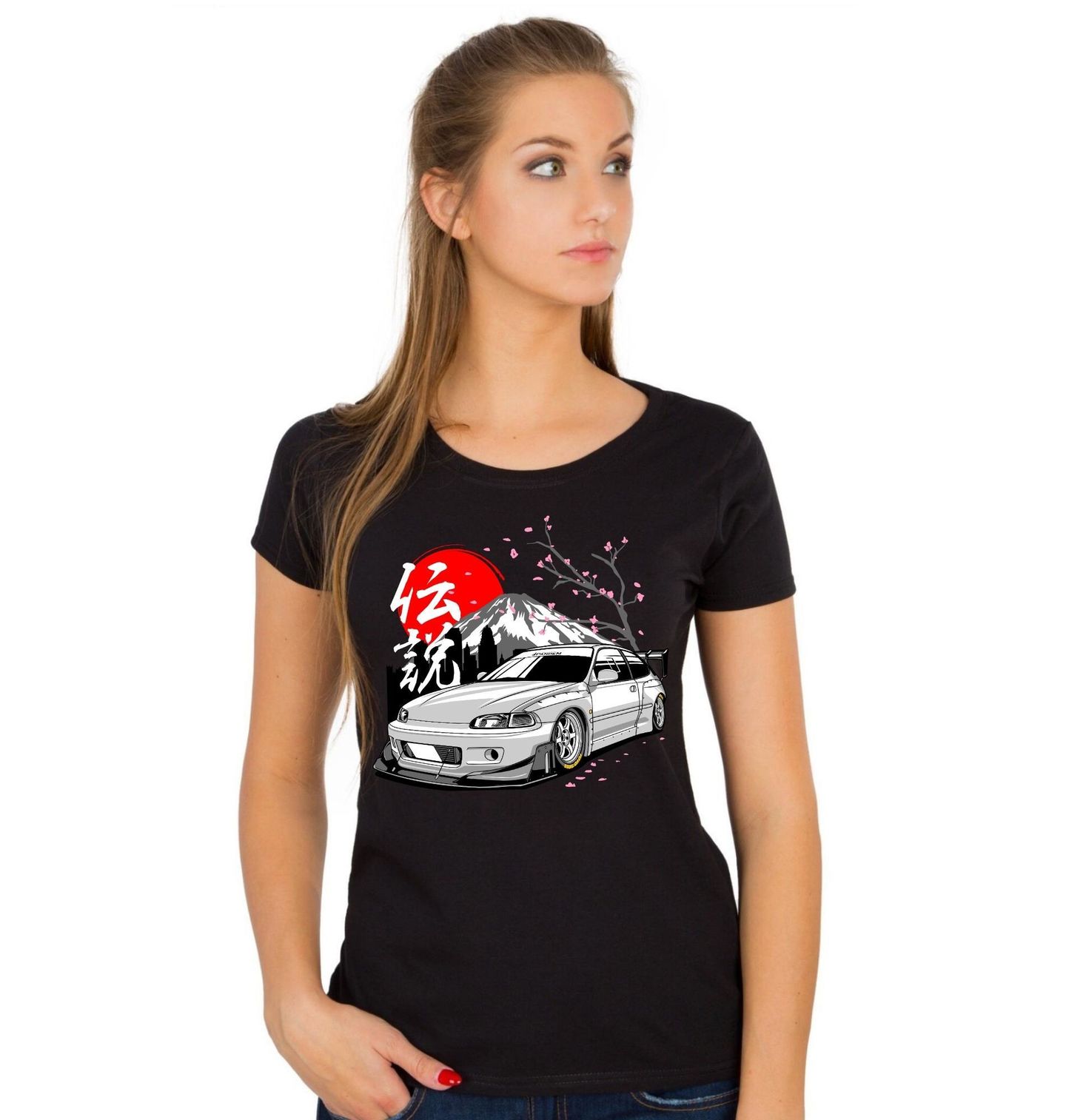 Dámské tričko JDM Legenda pod Horou Fudži. Stylový motiv zachycuje ikonické japonské auto Honda Civic EG v upraveném JDM stylu na pozadí symbolů, které definují Japonsko – vycházející slunce, hora Fudži a sakura. Tento design spojuje automobilovou kulturu s tradiční estetikou země vycházejícího slunce a vytváří výrazný vizuál pro každého fanouška tuningu a asijské scény.