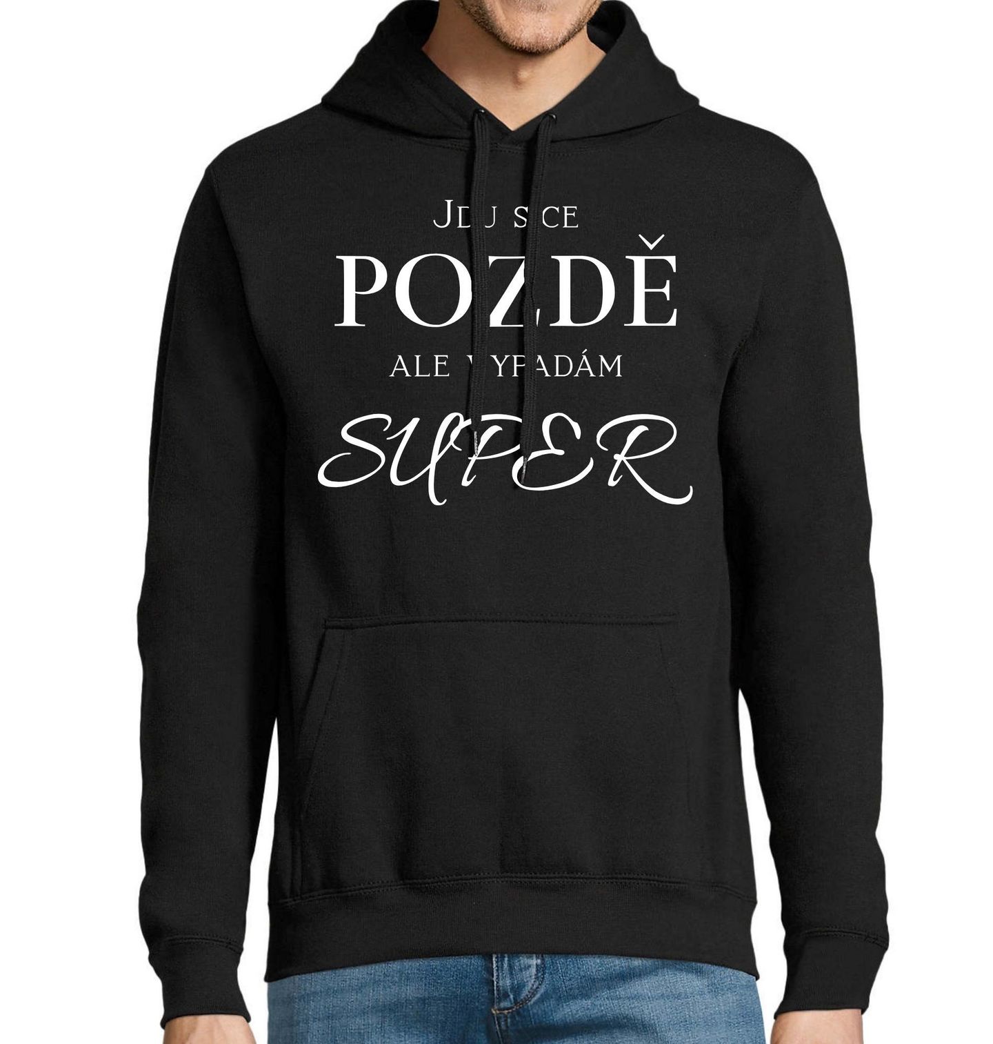 Pánská mikina Jdu Sice Pozdě ale Vypadám Super. Omluvte svůj pozdní příchod stylově s tímto vtipným motivem pro všechny milovníky módy. Originální nápis a minimalistický design tvoří ideální kombinaci pro každého, kdo si dává na svém vzhledu záležet. Tento vtipný potisk okamžitě zlepší náladu vám i lidem, na které jste nechali čekat. Pořiďte si tento originální kousek a ukažte světu, že na dokonalost se prostě vyplatí počkat.