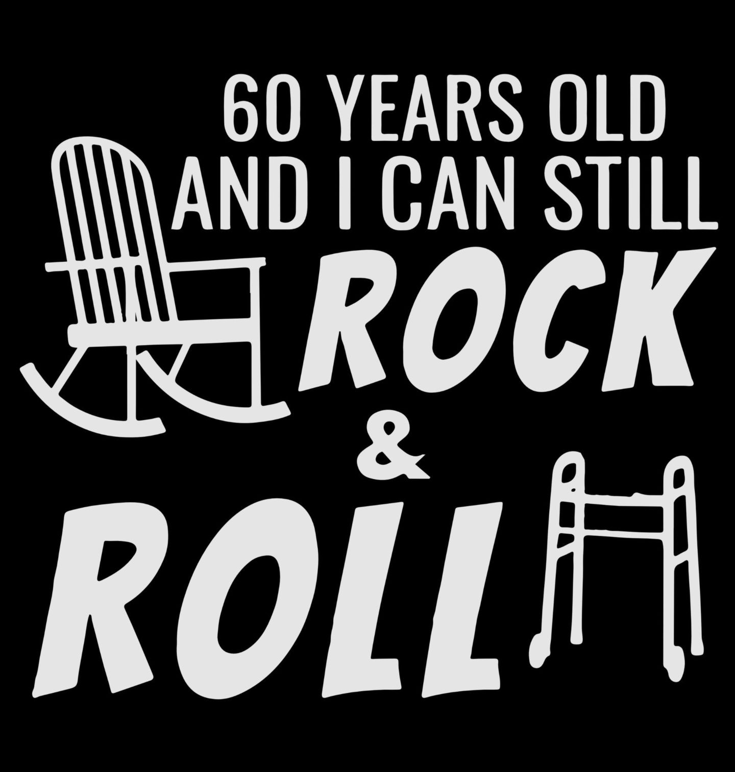 Pánské tričko Je mi 60 let a pořád umím rockovat. Humorný narozeninový design s nápisem “60 YEARS OLD AND I CAN STILL ROCK & ROLL” (v překladu „Je mi 60 let a pořád umím rockovat i se houpat“). Motiv doplňuje obrázek houpacího křesla a chodítka, což vytváří vtipný kontrast mezi věkem a energií. Ideální jako dárek k 60. narozeninám.