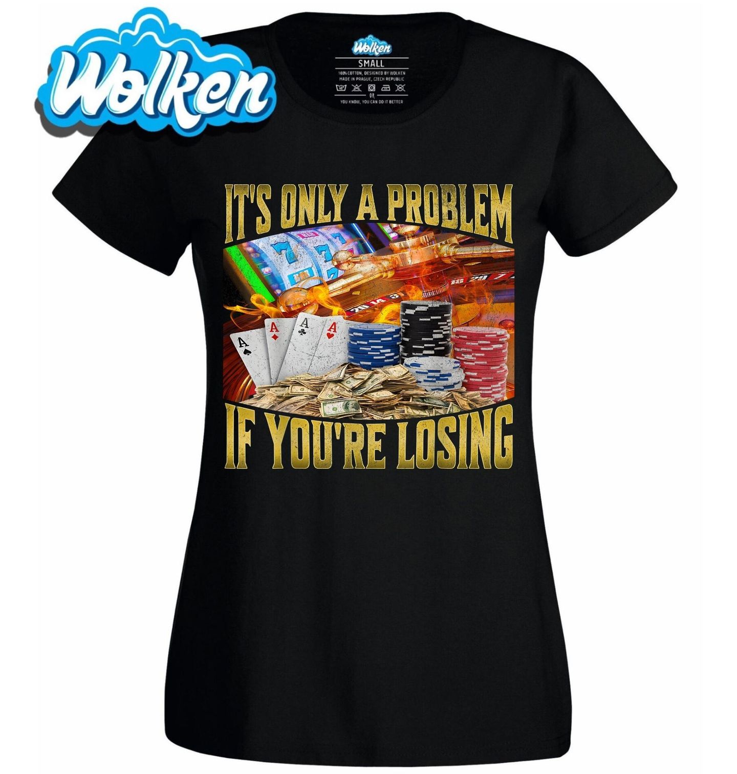Dámské tričko Je to problém jen když prohráváš. Tento design je jako dělaný pro fanoušky gamblingu, kasin a adrenalinu z výherních her. Na motivu najdete ikonické prvky hazardu: hrací automaty, žetony, ruletu, hromady hotovosti a čtyři esa. "It's only a problem if you're losing" → „Je to problém jen když prohráváš“