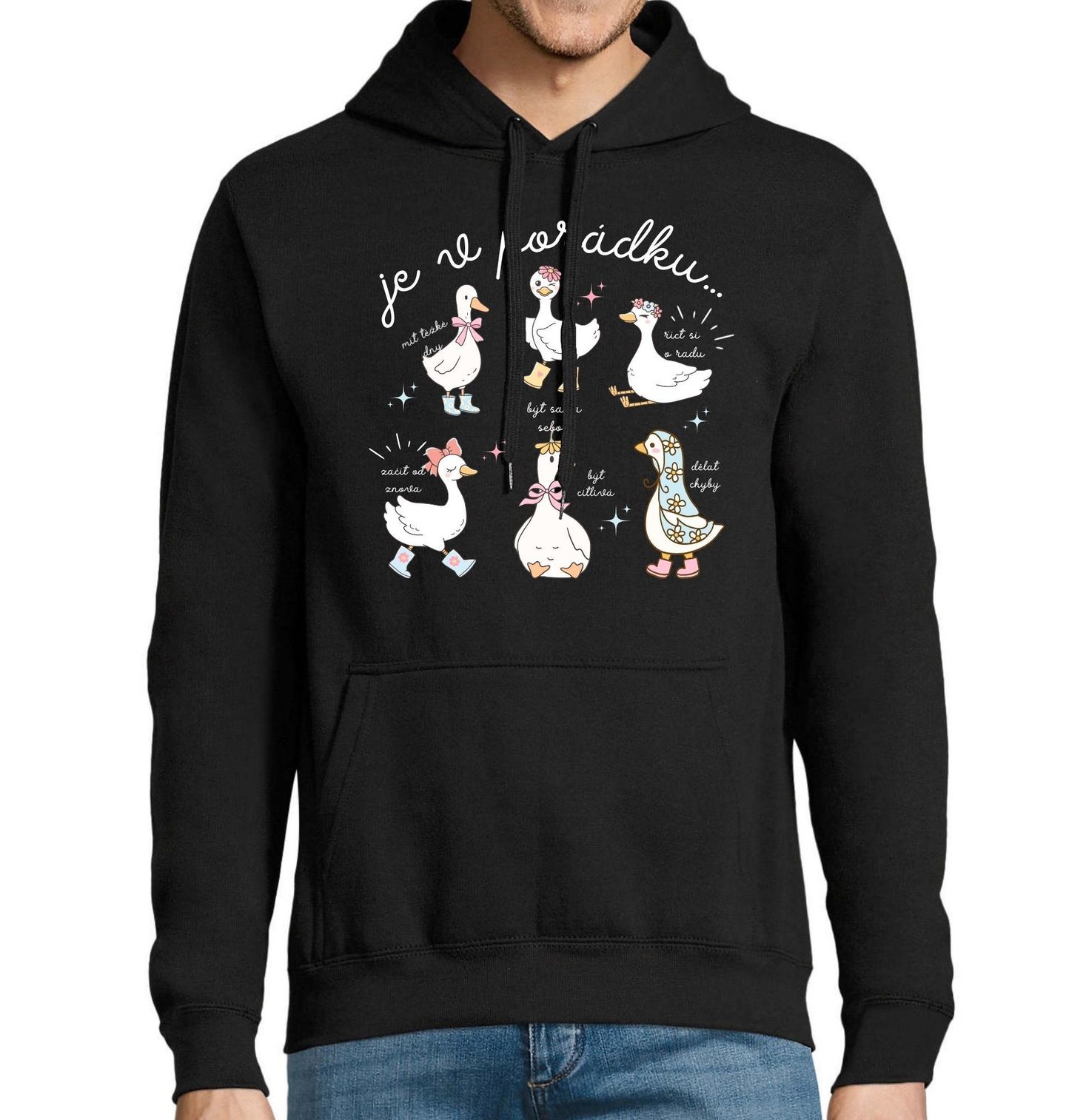 Pánská mikina Je v pořádku… být sama sebou. Roztomilý a jemně motivační motiv s husami, který připomíná, že je v pořádku být sama sebou a přijmout se taková, jaká jsi. Na motivu najdeš myšlenky: je v pořádku mít těžké dny, být sama sebou, říct si o radu, začít od znova, být citlivá, dělat chyby.