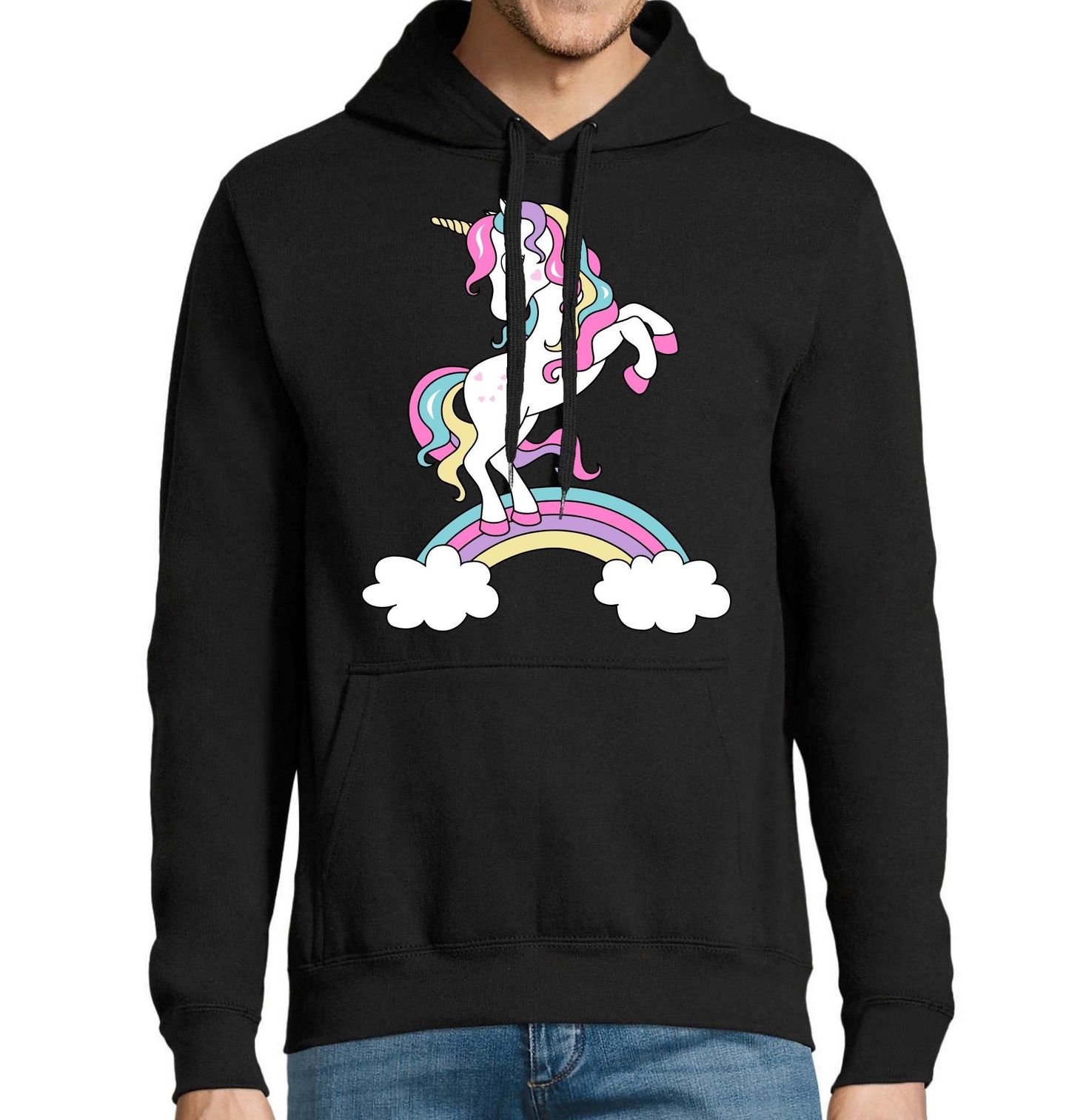 Pánská mikina Jednorožec na Duze. Roztomilý jednorožec stojící na duze přináší radost a fantazii. Pastelové barvy vytvářejí jemný a hravý vzhled. Design jednorožce je ideální pro milovníky pohádek a pozitivní energie.