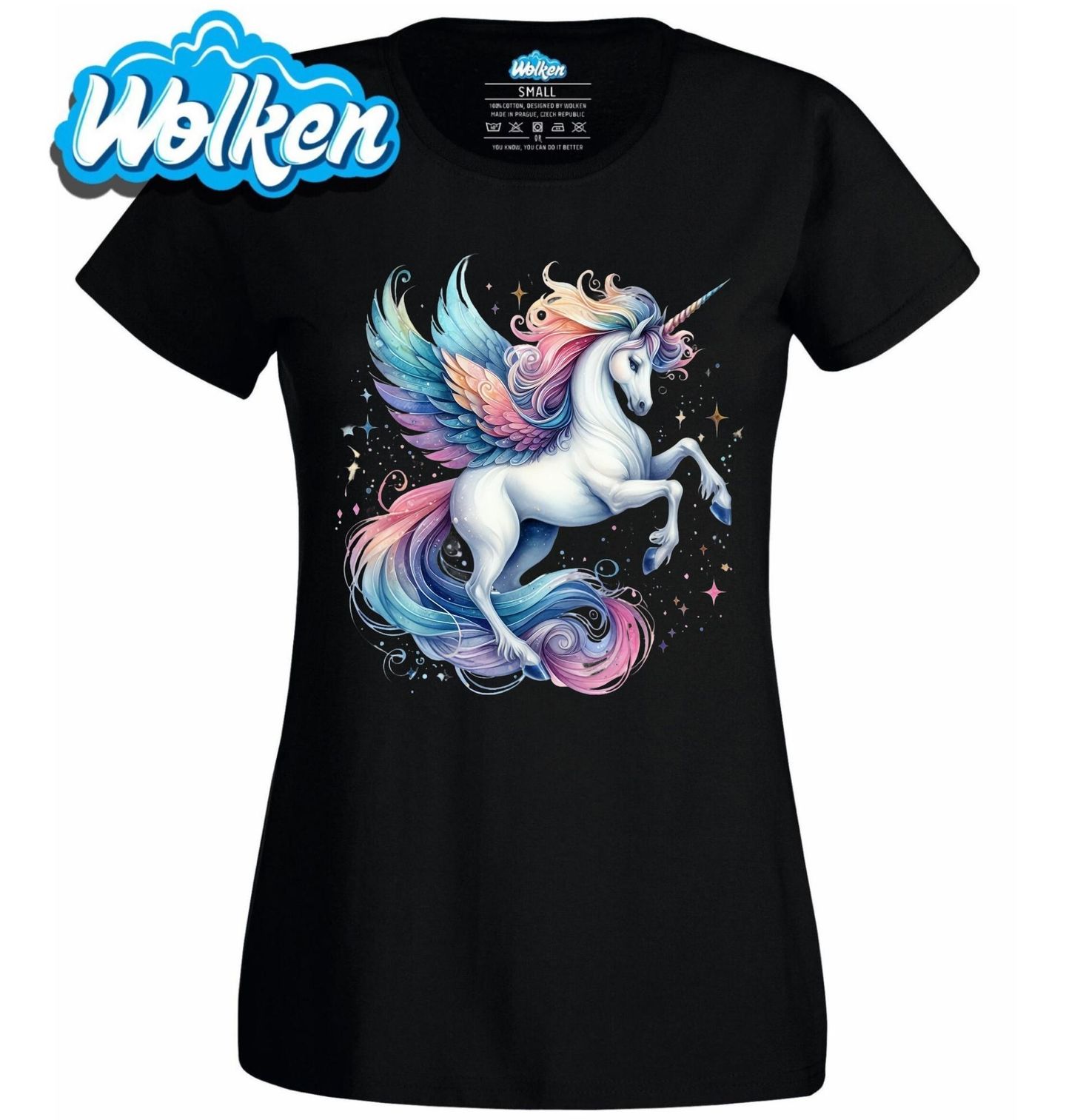 Dámské tričko Jednorožec Pegas. Tento magický jednorožec s křídly, někdy nazývaný také pegas, je jako stvořený pro děti, které milují pohádky a kouzla. Pegas (latinsky Pegasus) je v řecké mytologii okřídlený kůň, syn boha moří Poseidóna a Medúsy.