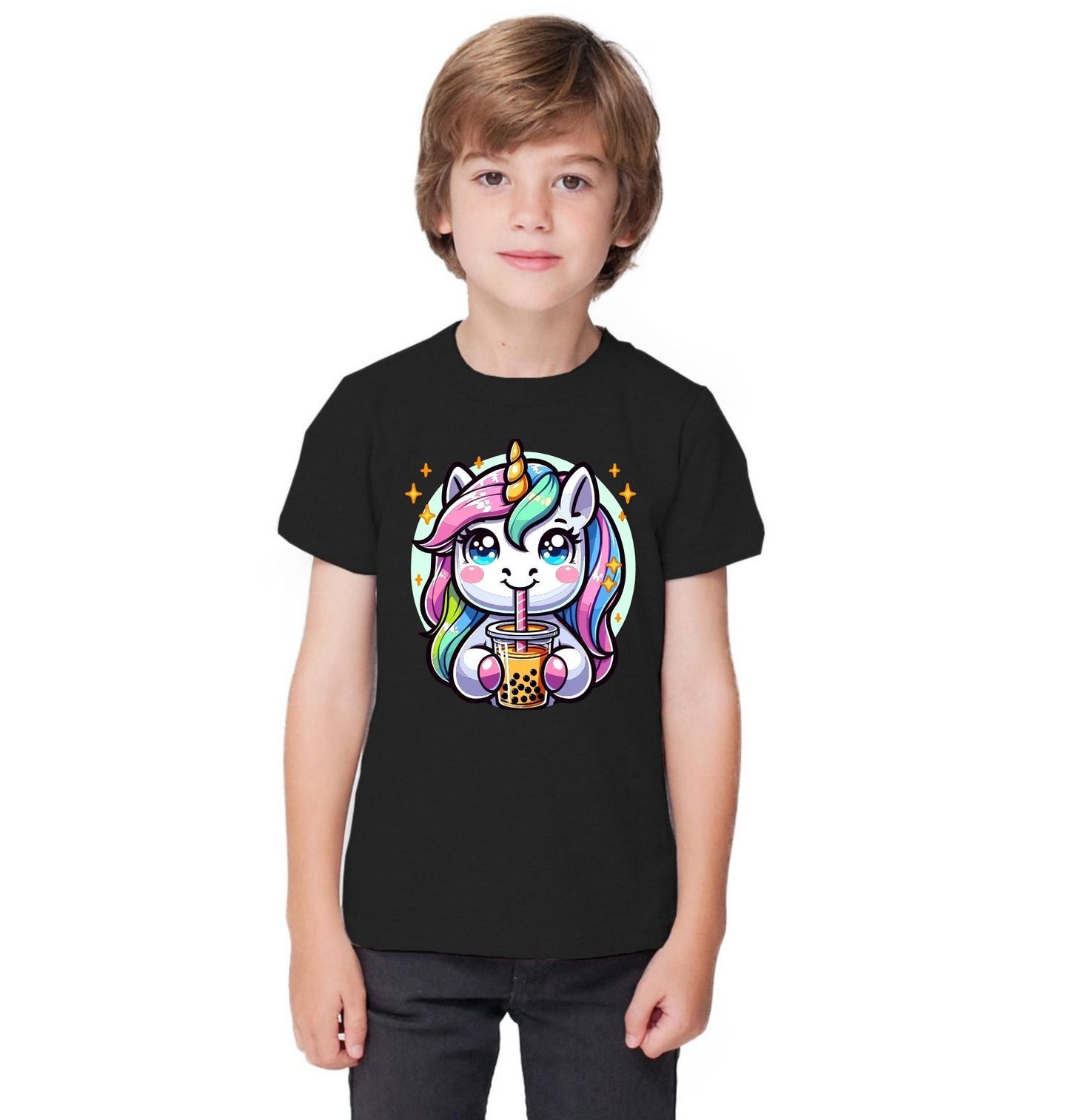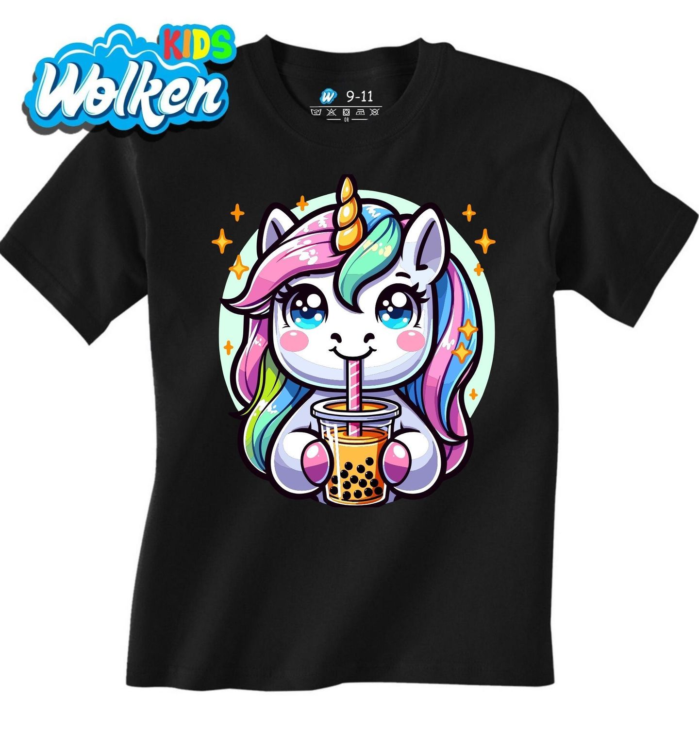 Dětské tričko Jednorožec s Bubble Tea. Roztomilý jednorožec s duhovou hřívou si vychutnává oblíbený nápoj bubble tea, a s každým douškem rozzáří svět kolem sebe. Tento motiv přináší spojení kouzelné fantazie a sladké radosti v jednom barevném designu. Ideální pro milovníky kawaii stylu, pohádkových postav a veselých bublinkových chvilek.