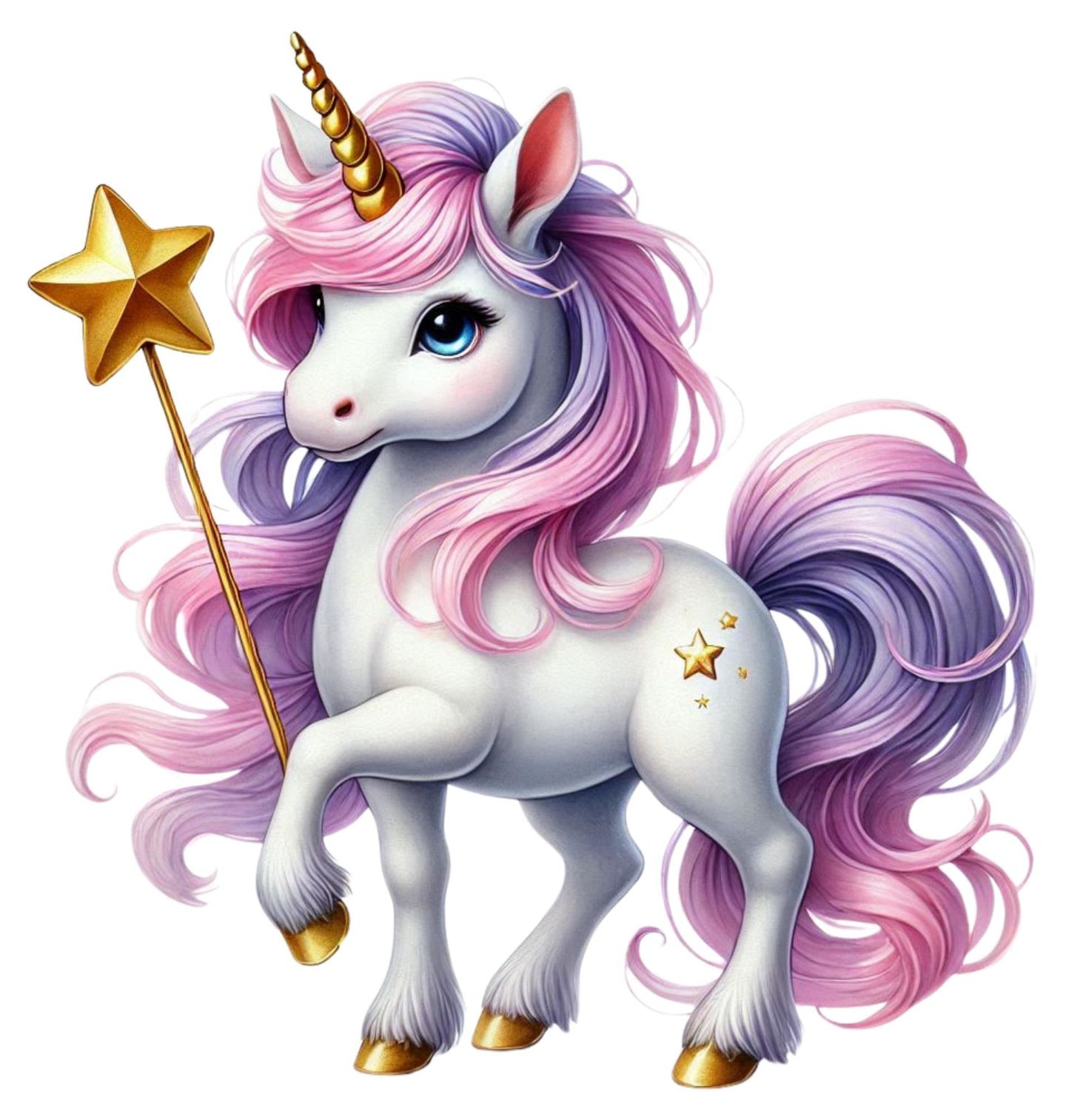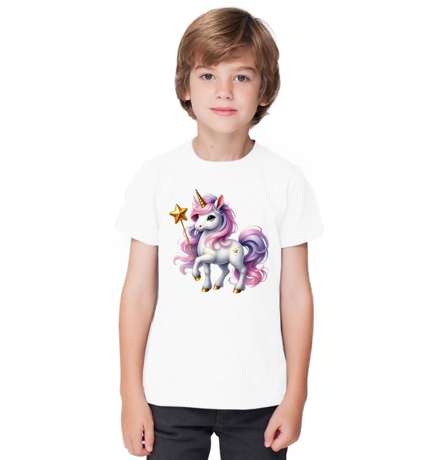 Dětské tričko Jednorožec s Kouzelnou Hůlkou. Roztomilý motiv „Jednorožec s kouzelnou hůlkou“ je perfektní volbou pro všechny malé i velké milovníky magie, pohádek a fantazie. Tento ilustrativní design zobrazuje elegantního tvora – jednorožce s růžovo-fialovou hřívou, který drží zlatou hvězdnou hůlku, připraven šířit radost a zázraky.