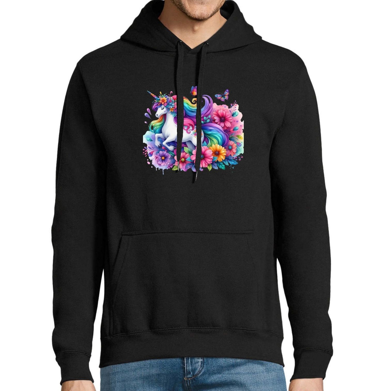 Pánská mikina Jednorožec v Květinovém Snu. Ponořte se do pohádkového světa, kde jednorožec tančí mezi zářivými květinami a motýly. Tento kouzelný motiv spojuje jemnost, fantazii a barevnou radost v jednom obrázku. Ideální pro každého milovníka magických bytostí, který chce nosit nebo darovat něco opravdu výjimečného.