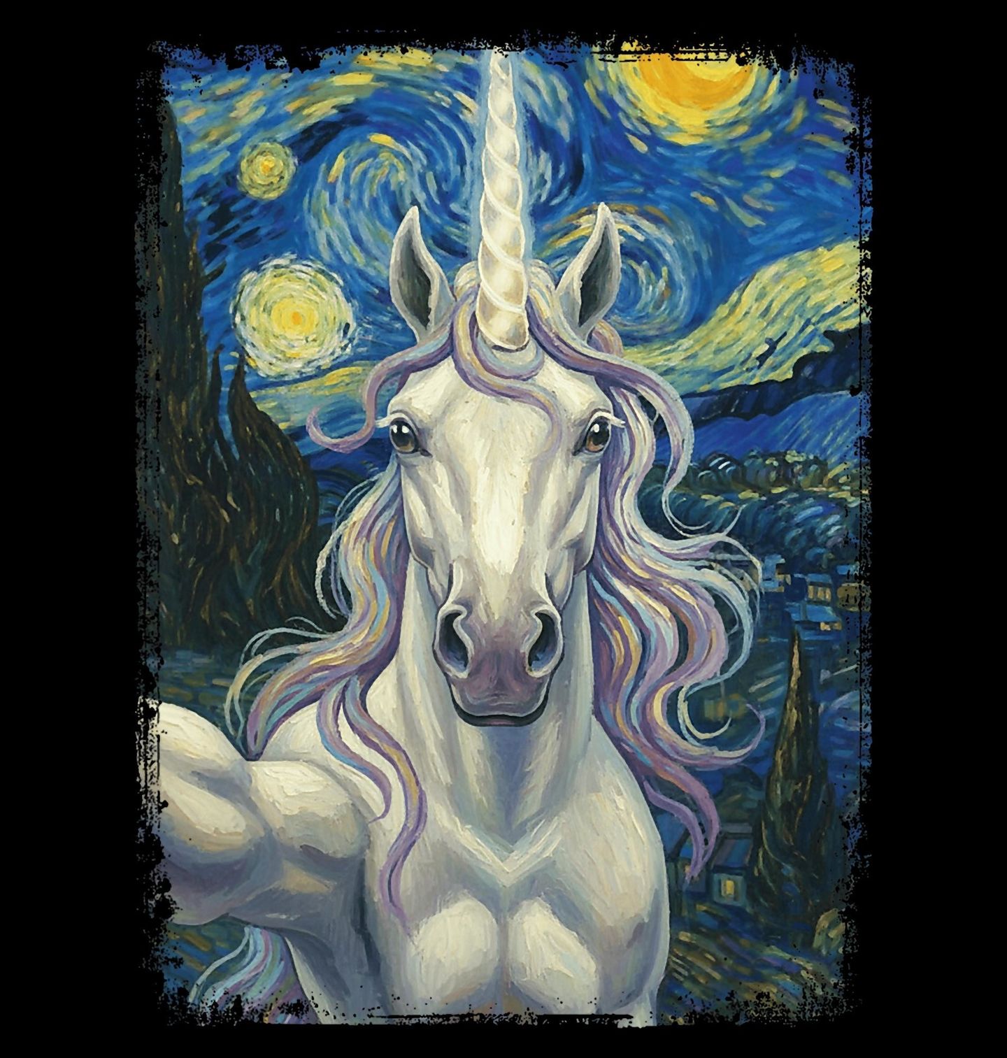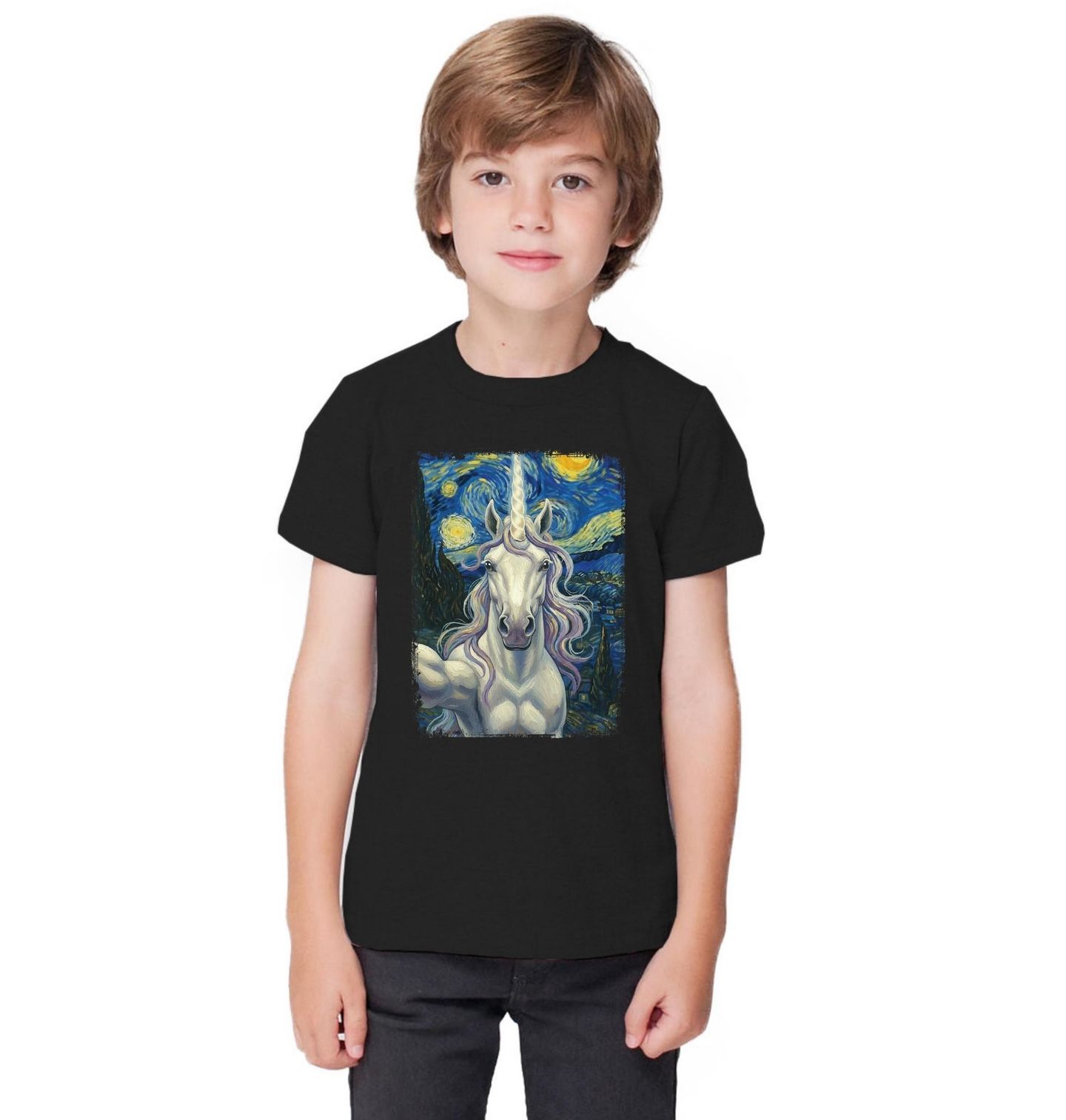 Dětské tričko Jednorožec ve Hvězdné noci. Kouzelný a snový motiv, který propojuje legendární umělecké dílo Hvězdná noc a fantazijní svět. V popředí stojí majestátní kůň, bájný jednorožec, který si jako by pořizoval selfie na pozadí noční oblohy malované ve stylu, kterým proslul Vincent van Gogh.