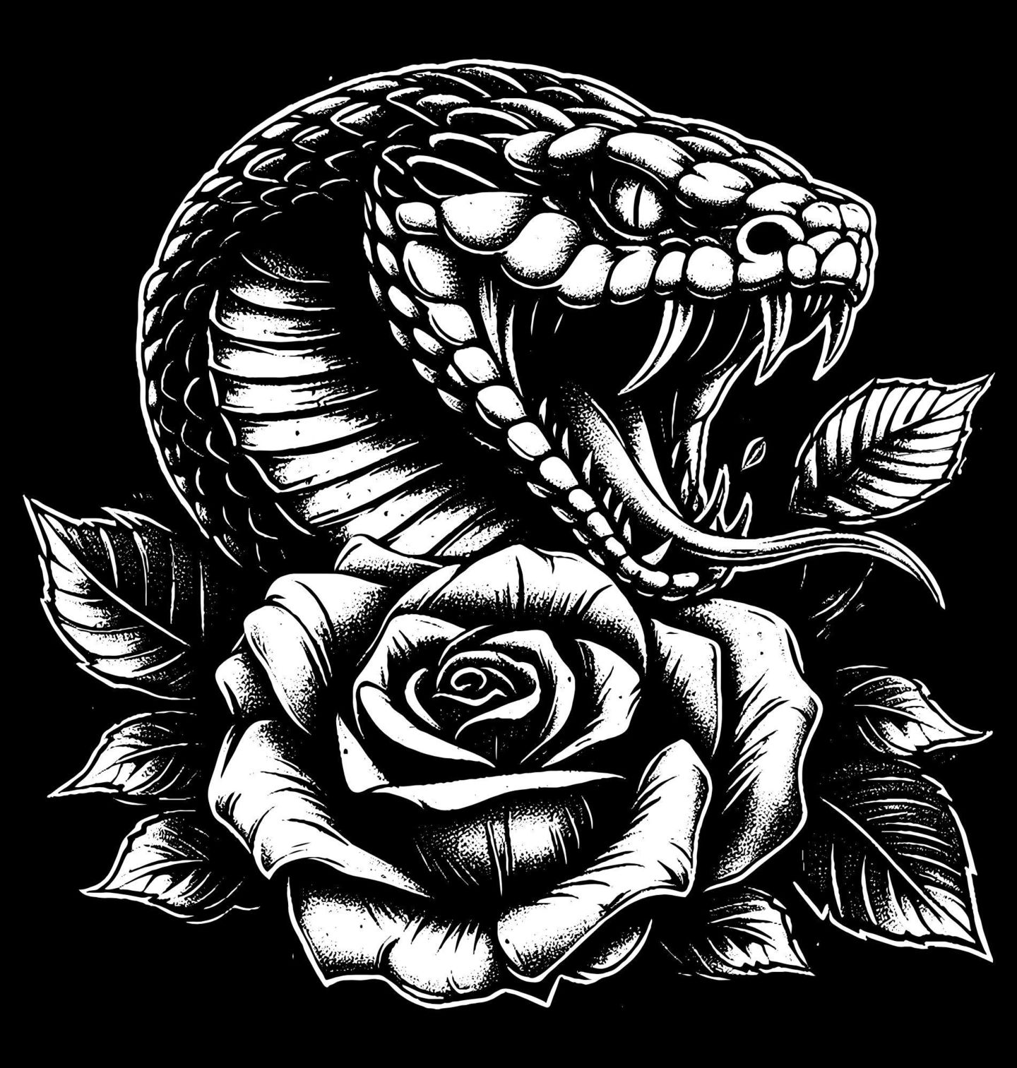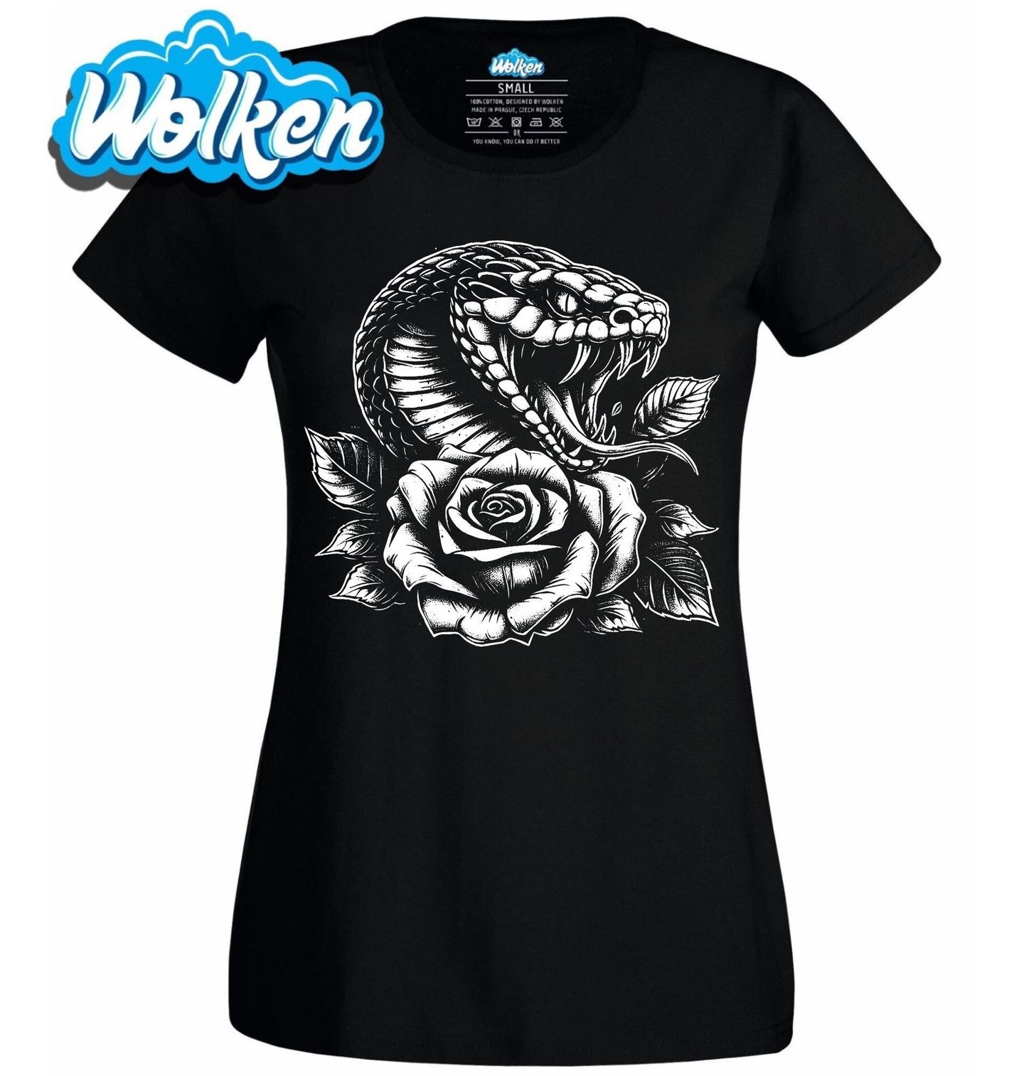 Dámské tričko Jedovatá Hadí Růže. Výrazný černobílý motiv připomíná tradiční tetovací styl a odkazuje na kontrasty života – krásu i nebezpečí, něhu i agresi. Otevřená tlama hada připraveného k útoku se proplétá s růží v plném květu. Motiv, který nosí sílu, eleganci i tajemství zároveň.