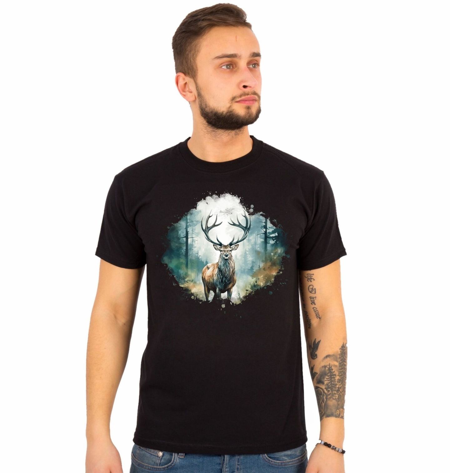 Pánské tričko Jelen evropský Strážce Lesa. Jelen lesní (Cervus elaphus), největší a nejznámější druh jelena žijící v Evropě. Tento majestátní jelen je symbolem síly, klidu a přirozené autority, kterou ztělesňuje hluboký les. Jelen lesní obývá rozsáhlé smíšené a horské lesy, kde se pohybuje tiše a s respektem ke svému území.