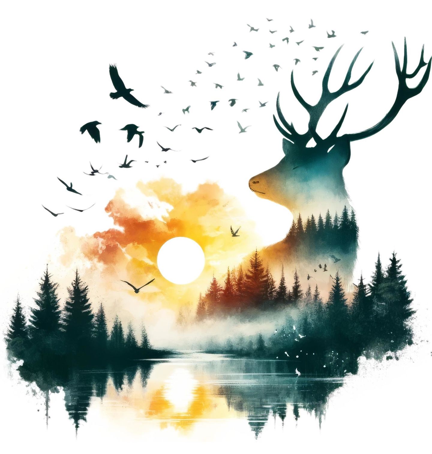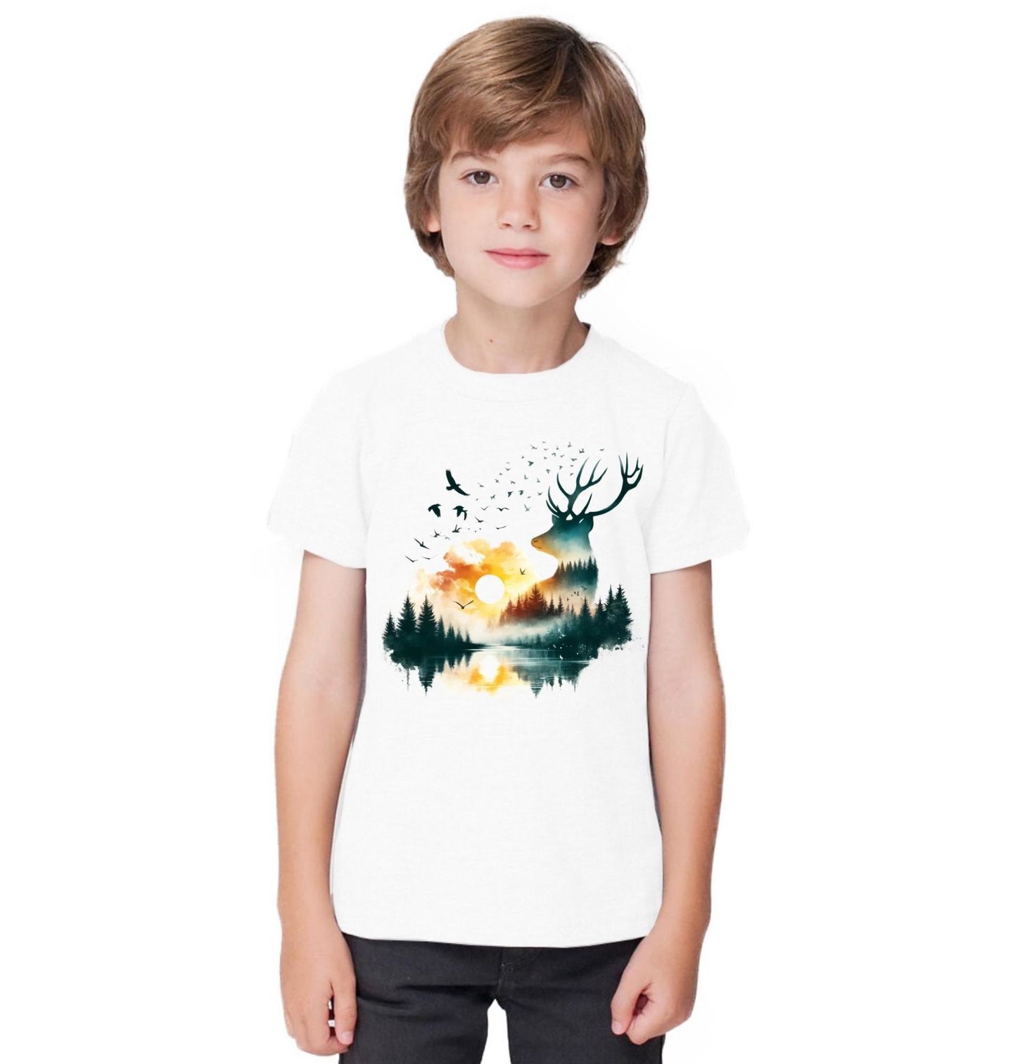 Dětské tričko Jelen Lesní Krajina. Silný přírodní motiv jelena s mohutným parožím, jehož silueta splývá s lesní krajinou, vodou a zapadajícím sluncem. Letící ptáci a mlha dodávají scéně hloubku a klid. Vhodný dárek pro každého milovníka lesů.