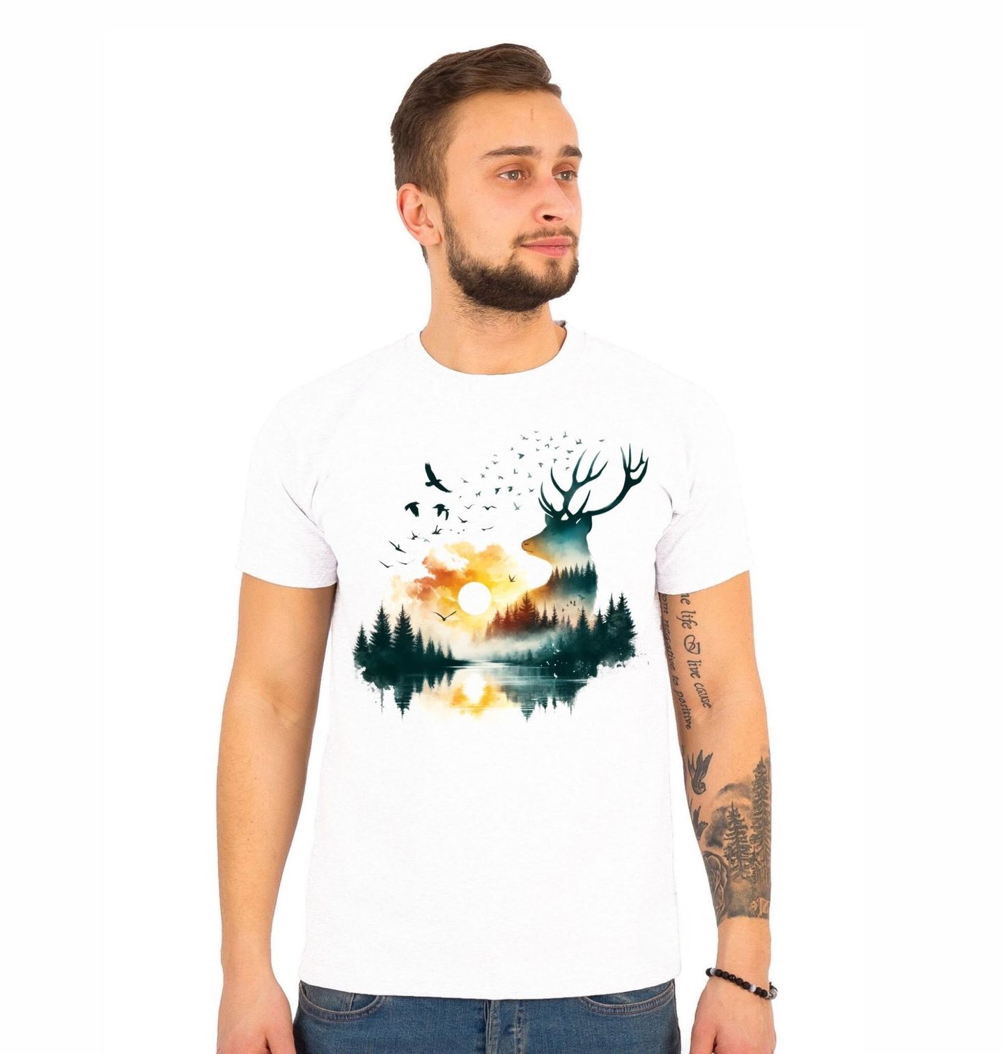 Pánské tričko Jelen Lesní Krajina. Silný přírodní motiv jelena s mohutným parožím, jehož silueta splývá s lesní krajinou, vodou a zapadajícím sluncem. Letící ptáci a mlha dodávají scéně hloubku a klid. Vhodný dárek pro každého milovníka lesů.