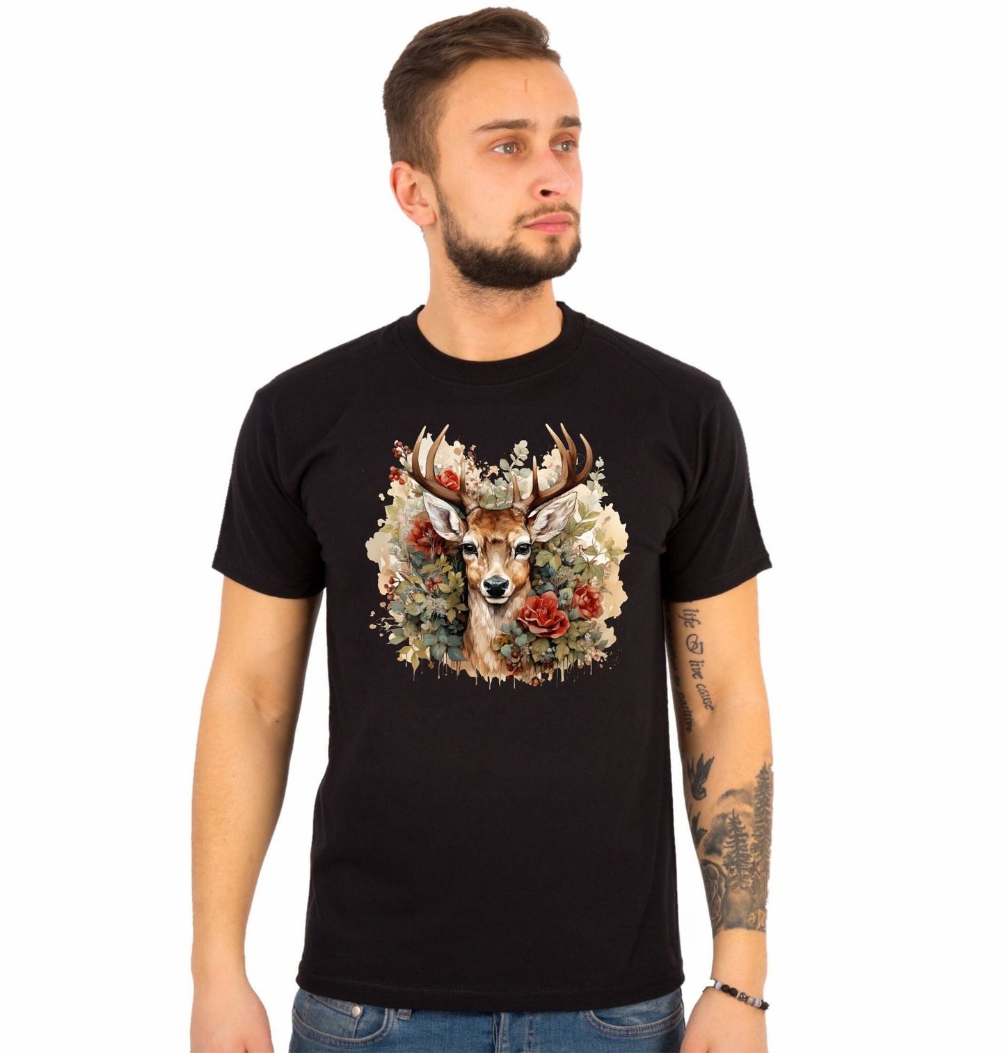 Pánské tričko Jelen mezi Květinami. Přeneste se do srdce přírody s tímto nádherným motivem jelení hlavy s majestátními parohy, obklopené detailně zpracovanými lesními květinami a listy. Design spojuje sílu divoké zvěře s jemností rostlin – ideální pro všechny milovníky přírody, lesa a volnosti.