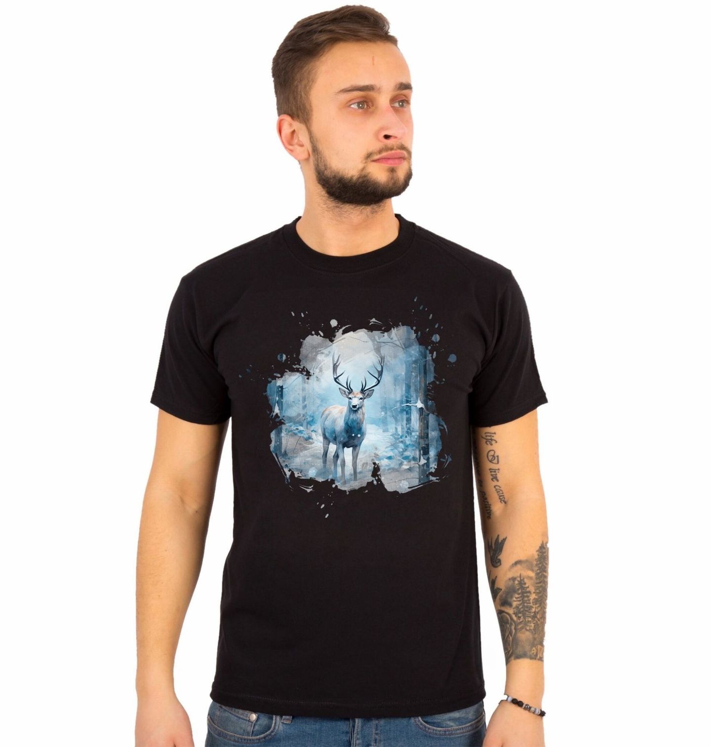 Pánské tričko Jelen v Zasněženém Lese. Tento působivý akvarelový motiv zachycuje majestátního jelena, který tiše stojí uprostřed zimní krajiny. Mlhou zahalený les a jemně padající sníh vytvářejí atmosféru klidu, síly a respektu k přírodě. Jelen zde vystupuje jako symbol rovnováhy, moudrosti a ochrany lesa v chladném zimním období.