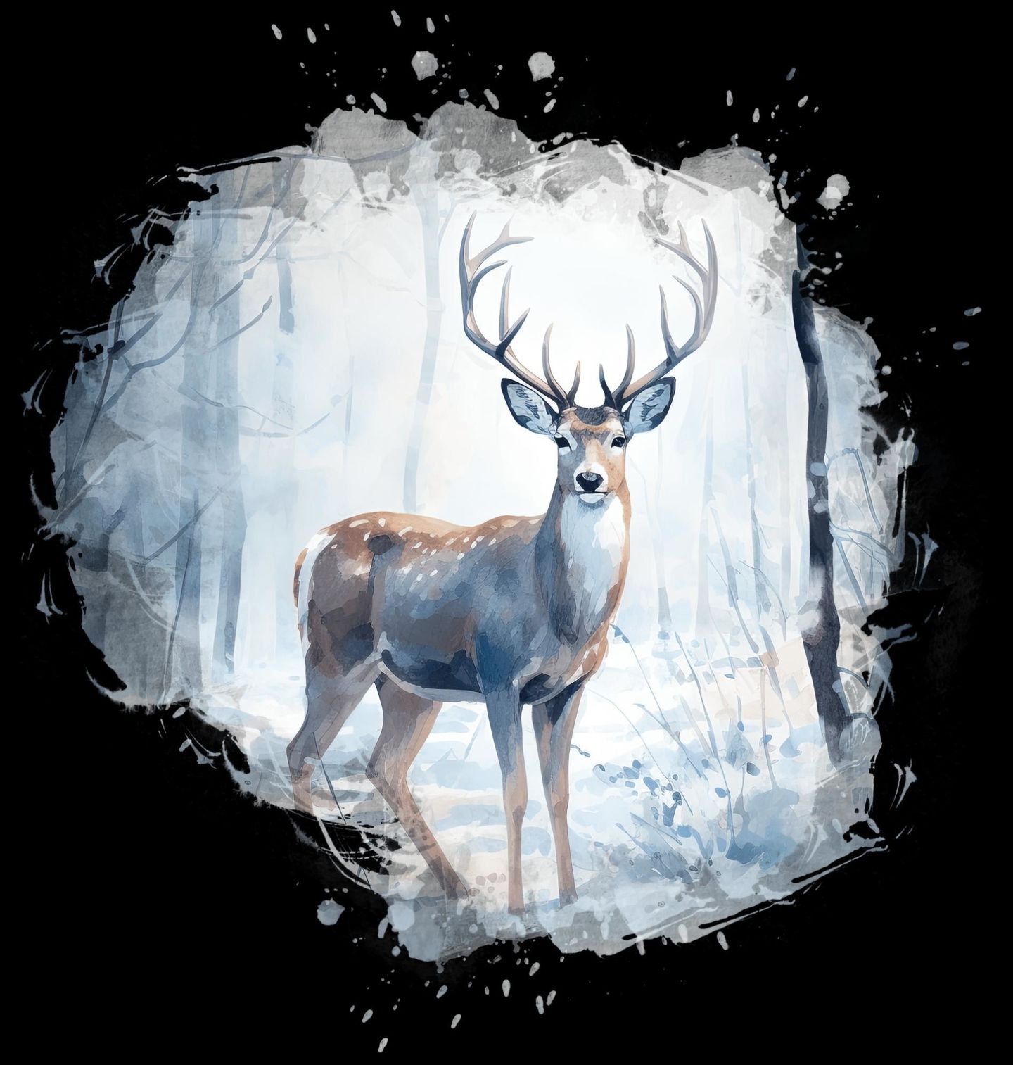 Pánské tričko Jelen v Zimním Lese. Tento jemný akvarelový motiv zachycuje majestátní zvíře v tichém zimním prostředí, kde jelen stojí jako symbol klidu, síly a harmonie s přírodou. Mlžný les zahalený do bílého ticha vytváří pohádkovou atmosféru, ve které vyniká čistota zimy a přirozená krása divoké přírody. Sníh pod kopyty a mezi stromy dodává obrazu pocit klidu, rovnováhy a zpomalení.