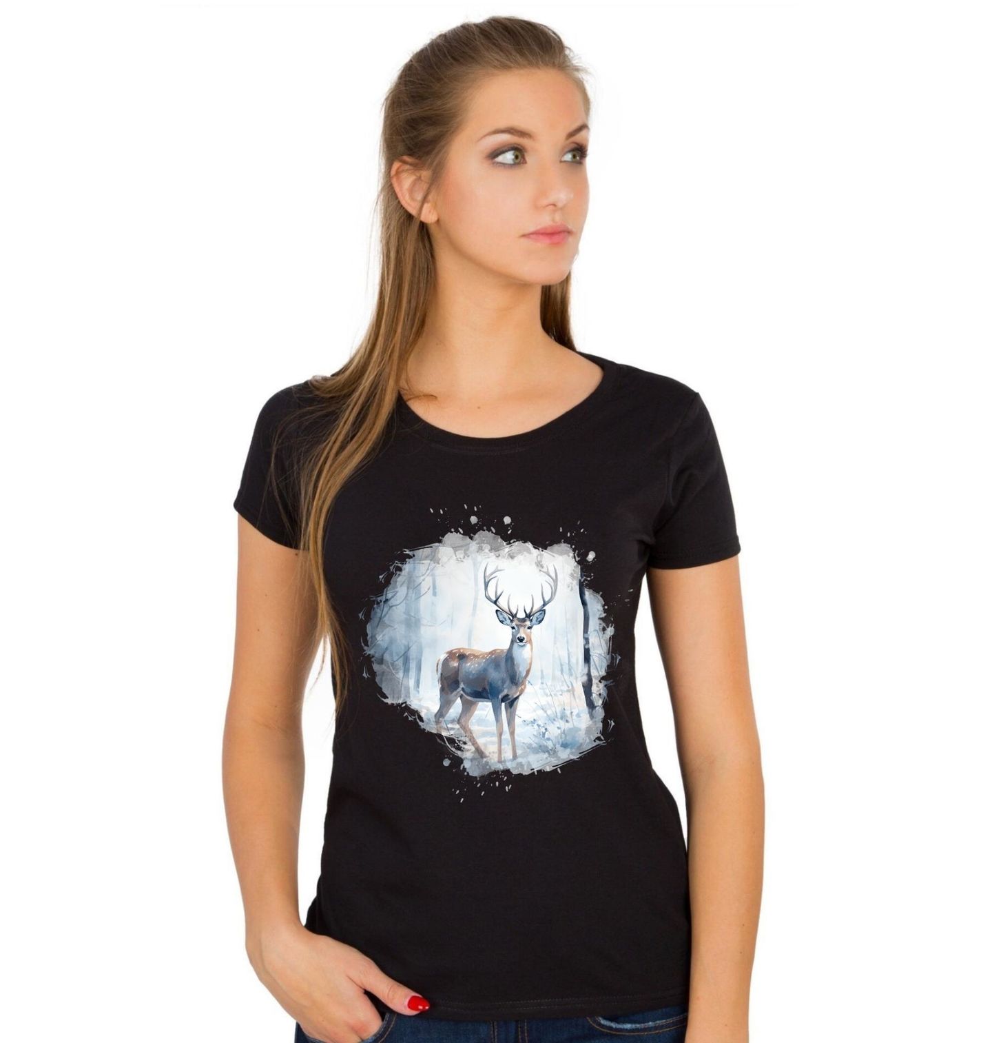 Dámské tričko Jelen v Zimním Lese. Tento jemný akvarelový motiv zachycuje majestátní zvíře v tichém zimním prostředí, kde jelen stojí jako symbol klidu, síly a harmonie s přírodou. Mlžný les zahalený do bílého ticha vytváří pohádkovou atmosféru, ve které vyniká čistota zimy a přirozená krása divoké přírody. Sníh pod kopyty a mezi stromy dodává obrazu pocit klidu, rovnováhy a zpomalení.