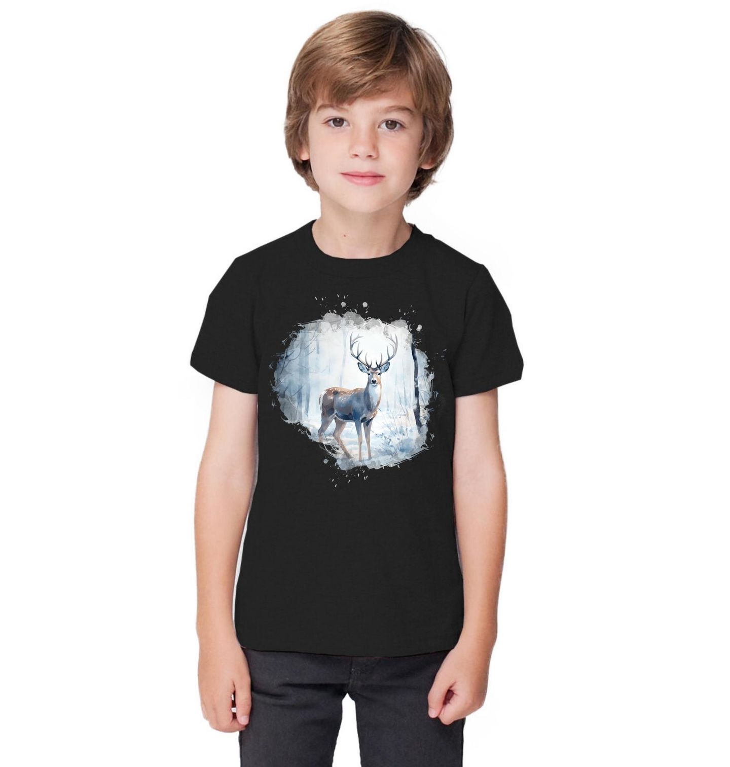 Dětské tričko Jelen v Zimním Lese. Tento jemný akvarelový motiv zachycuje majestátní zvíře v tichém zimním prostředí, kde jelen stojí jako symbol klidu, síly a harmonie s přírodou. Mlžný les zahalený do bílého ticha vytváří pohádkovou atmosféru, ve které vyniká čistota zimy a přirozená krása divoké přírody. Sníh pod kopyty a mezi stromy dodává obrazu pocit klidu, rovnováhy a zpomalení.