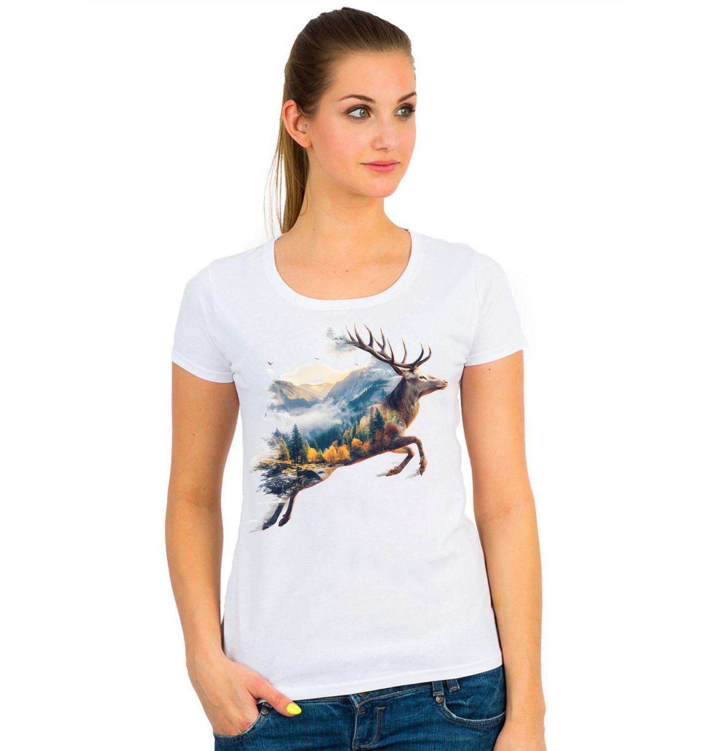 Dámské tričko Jelen ve Skoku v Krajině. Unikátní motiv, který propojuje majestátní jelena s nádhernou horskou scenérií, kde se prolíná krajina plná lesů, hor a mlhy. Tento design zachycuje sílu, klid i divokost přírody a vytváří harmonický celek, který osloví každého milovníka přírody, zvířat či dokonce i lovce.