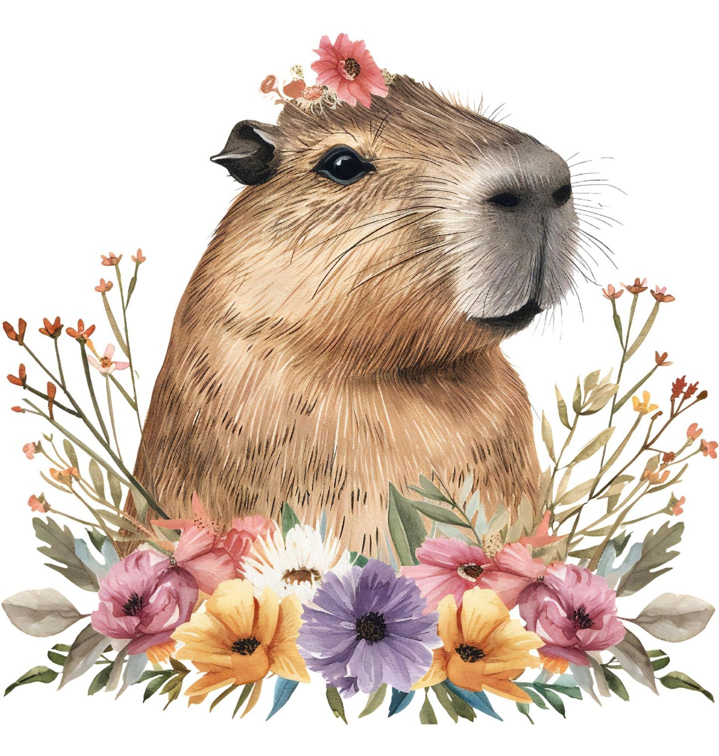 Dámské tričko Jemná Kapybara v Květinách. Kapybara v květinové koruně je přesně tím motivem, který si zamilují milovníci přírody, zvířat i jemné elegance. Největší hlodavec světa – kapybaru – obklopeného jemnými květinami v pastelových tónech.