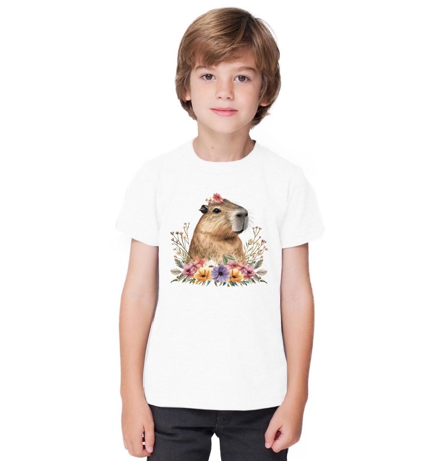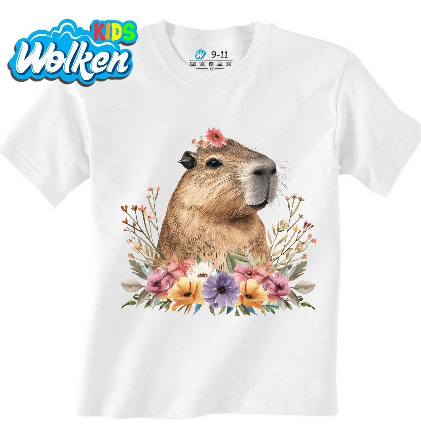 Dětské tričko Jemná Kapybara v Květinách. Kapybara v květinové koruně je přesně tím motivem, který si zamilují milovníci přírody, zvířat i jemné elegance. Největší hlodavec světa – kapybaru – obklopeného jemnými květinami v pastelových tónech.
