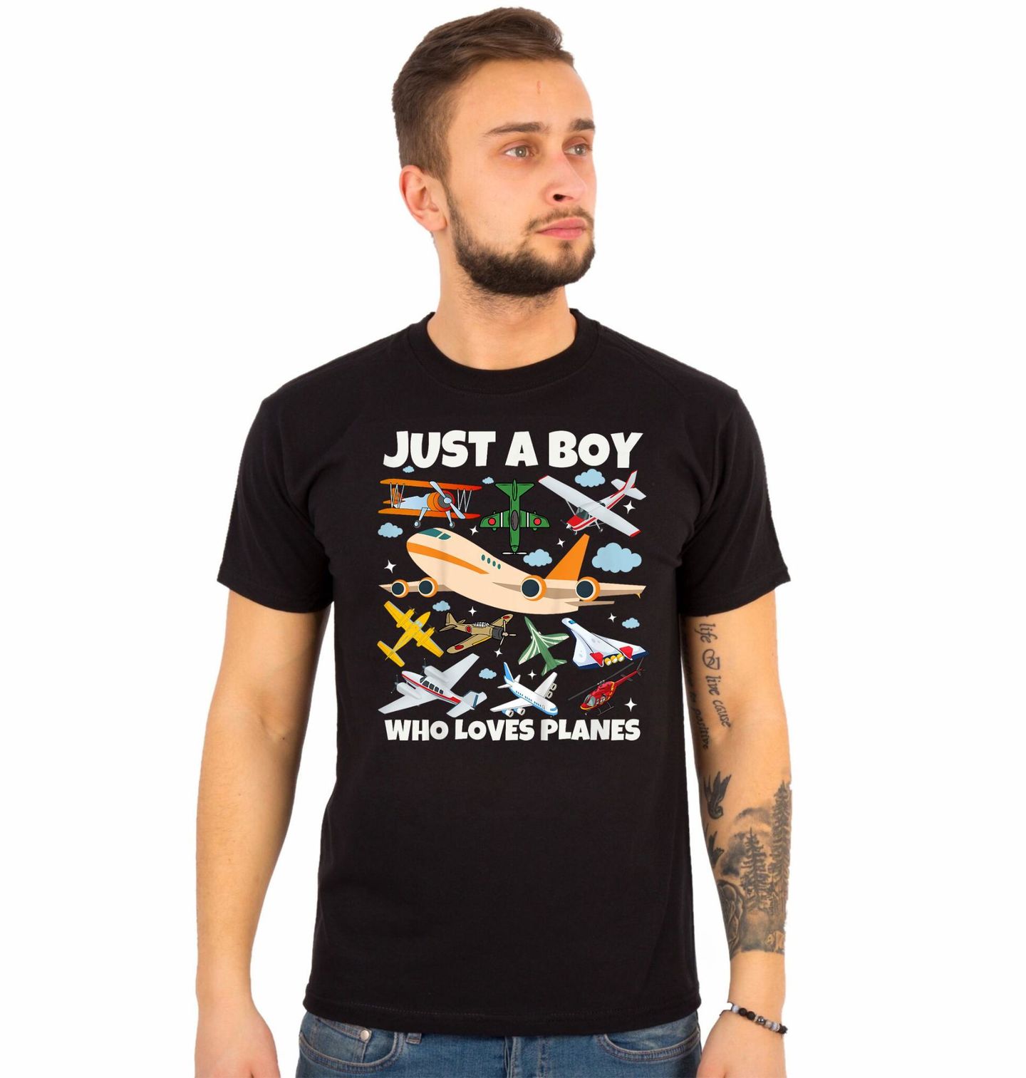 Pánské tričko Jen kluk, který miluje letadla. Hravý a barevný motiv plný různých typů strojů, kde letadlo symbolizuje dobrodružství a dětský sen o létání. Nápis „JUST A BOY WHO LOVES PLANES“ znamená „Jen kluk, který miluje letadla“ a dokonale vystihuje vášeň pro létání a objevování oblohy.