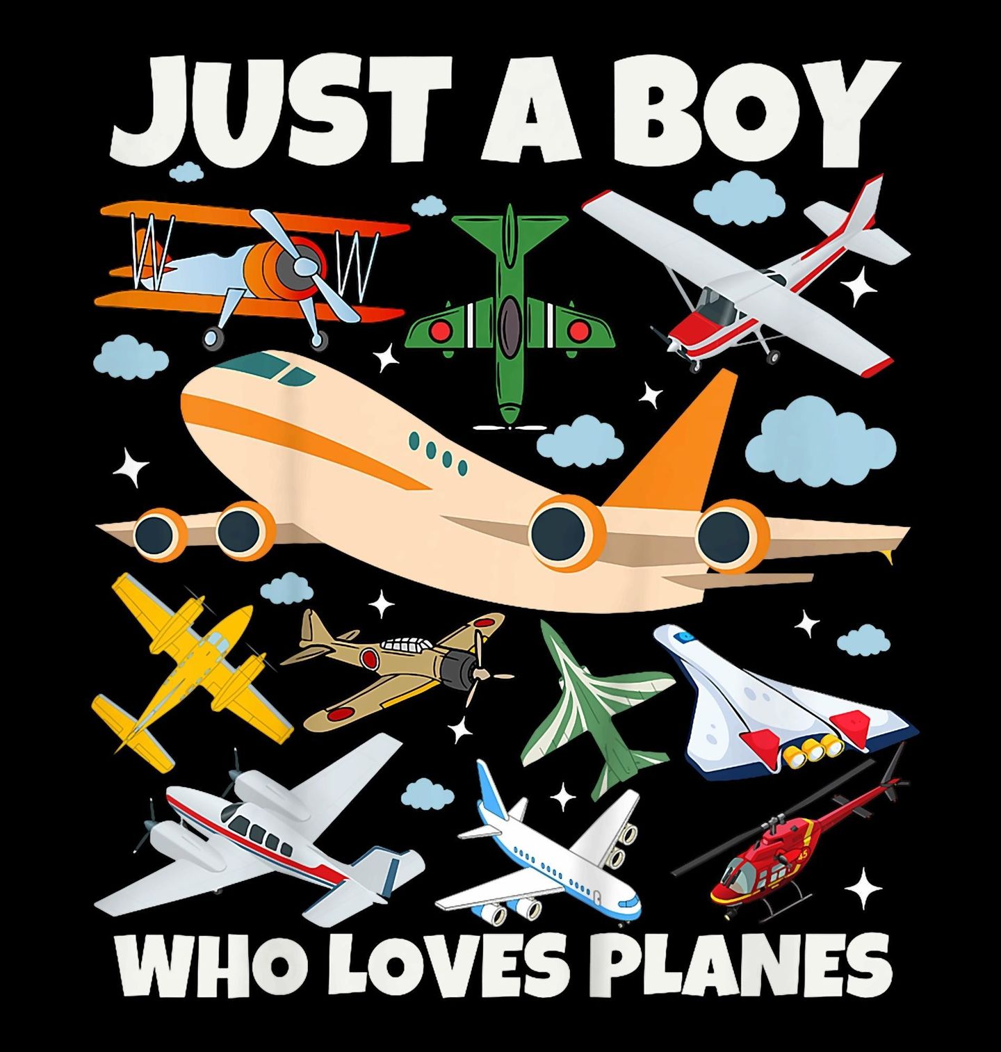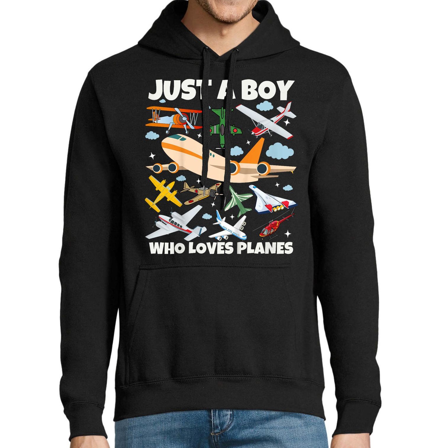 Pánská mikina Jen kluk, který miluje letadla. Hravý a barevný motiv plný různých typů strojů, kde letadlo symbolizuje dobrodružství a dětský sen o létání. Nápis „JUST A BOY WHO LOVES PLANES“ znamená „Jen kluk, který miluje letadla“ a dokonale vystihuje vášeň pro létání a objevování oblohy.
