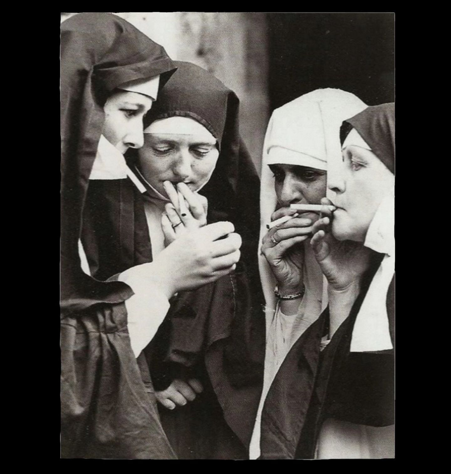 Dámské tričko Jeptišky na cigaretě. Jeptišky si také moc rády jednu zapálí, když jim to farář dovolí. Podle katolické církve jeptišky kouřit mohou, pokud to nepřehánějí hřích to není. Není nad to si zapálit cigaretu po nedělní mši.