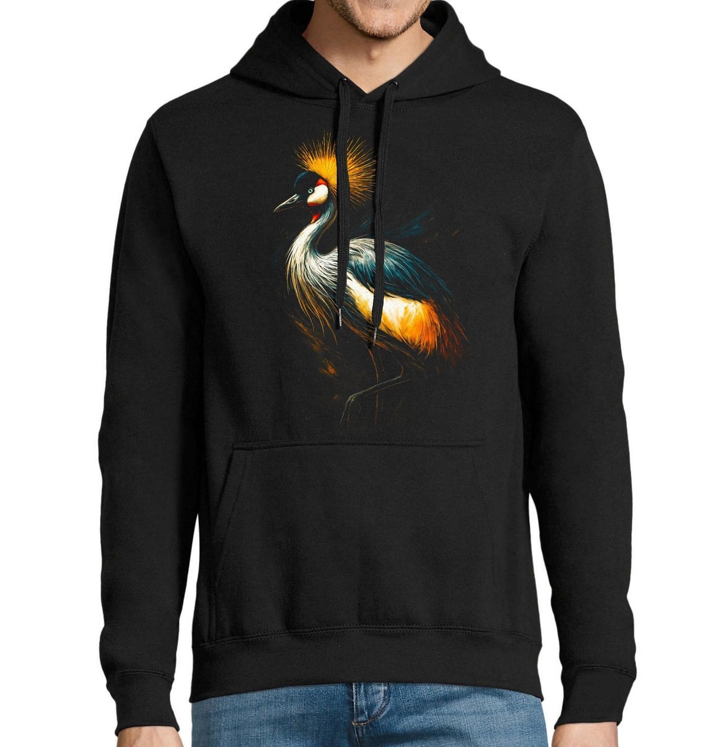 Pánská mikina Jeřáb královský. Jeřáb královský je velký pták, zástupce čeledi jeřábovitých. Obývá vyprahlé savany v Africe jižně od Sahary. Elegantní pták, který je známý svou typickou zlatou chocholkou a vznešeným postojem. Tento pták patří mezi nejkrásnější druhy afrických jeřábů a symbolizuje noblesu, svobodu i sílu přírody.