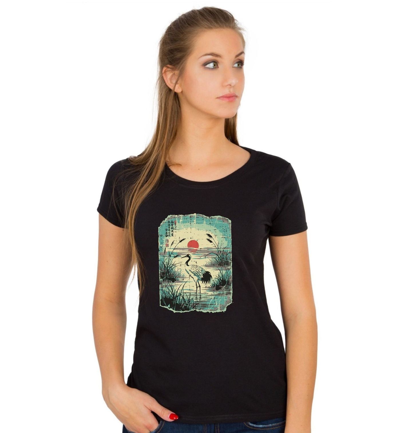 Dámské tričko Jeřáb Mandžuský při Západu Slunce Ukiyo-e Art. Tento nádherný motiv zachycuje elegantního ptáka jeřába (konkrétně jeřáb mandžuský / Red-crowned crane), který stojí v klidné vodní krajině při západu slunce. Jeřáb je v Japonsku symbolem dlouhověkosti, štěstí a harmonie. Styl připomíná tradiční japonské dřevořezy (ukiyo-e). Pokud miluješ Japonsko a přírodu, tenhle motiv je jako stvořený právě pro tebe.