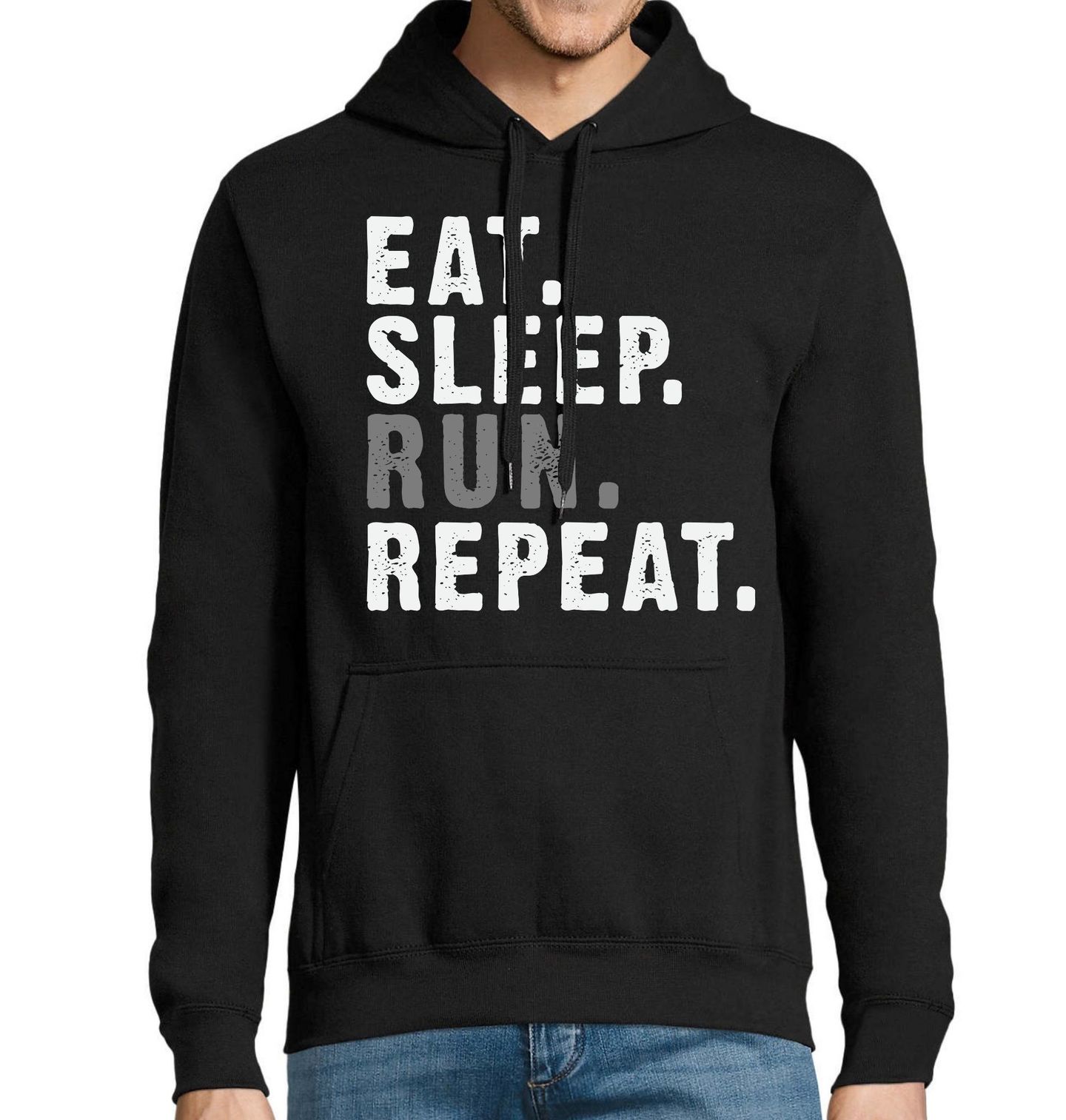 Pánská mikina Jez Spi Běhej Opakuj Eat Sleep Run Repeat. Výrazný motiv je určen pro všechny, pro které je běh a sport každodenní rutinou, vášní a životním stylem. Syrová struktura písma a kontrastní provedení zdůrazňují disciplínu, vytrvalost a opakování, které vedou k lepším výkonům. Ideální volba na trénink, závody i běžné nošení – všude tam, kde chceš dát jasně najevo, že běh patří do tvého dne.